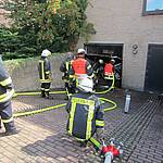 Um 16:04 Uhr am heutigen Montagnachmittag wurde der Löschzug 1 erneut komplett über alle drei Meldegruppen alarmiert. Die Alarmdepesche sprach von „Brand-Gebäude, es brennt in der Garage im Haus“. Beim Eintreffen der Feuerwehr wurde festgestellt, dass aus einer im Kellerbereich der Praxis Drs. Bartsch, Mumm und Kuck im Brikhof gelegenen Garage Rauch drang. Auch die Praxisräume im angrenzenden Souterrainbereich waren bereits leicht verraucht. Allerdings brannte lediglich das Holz-Garagentor im unteren Bereich. Dieses musste von den Einsatzkräften gewaltsam mit der Rettungssäge geöffnet werden, weil der Eigentümer nicht greifbar war. Ein Trupp unter Atemschutz konnte die schwelende Stelle schnell ablöschen. Ein Übergreifen des Feuers auf die in der Garage gelagerten Gegenstände konnte so vermieden und größerer Schaden abgewendet werden.