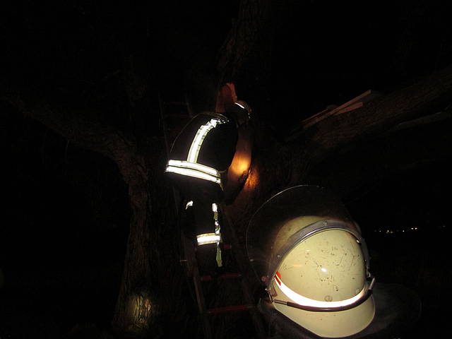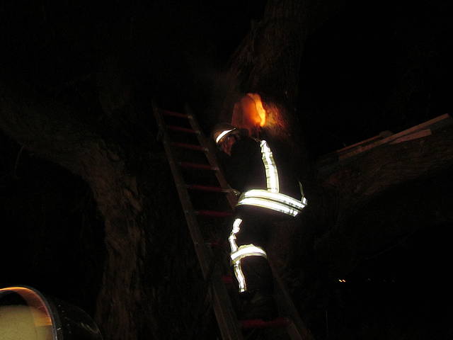 Gemeldet wurde ein „Brand klein“ als am 14.11.2011 um 17:08 Uhr der Melder ging. In den Wiesen am Ende der Bergstraße war eine alte Weide in Brand geraten. Im hohlen Baum konnte sich das Feuer trefflich verbreiten. Mit Wasser, Schaum und Kettensäge rückte der Löschzug 1 dem brennenden Baum auf die Rinde. Bis aber letztlich alle Glutnester gefunden waren dauerte es gute 2,5 Stunden. Erst gegen 19:30 Uhr konnten die Helfer wieder abrücken, nachdem die Einsatzstelle an den städtischen Bauhof übergeben wurde. Der muss nun prüfen, ob die Standsicherheit der alten Weide gefährdet ist.