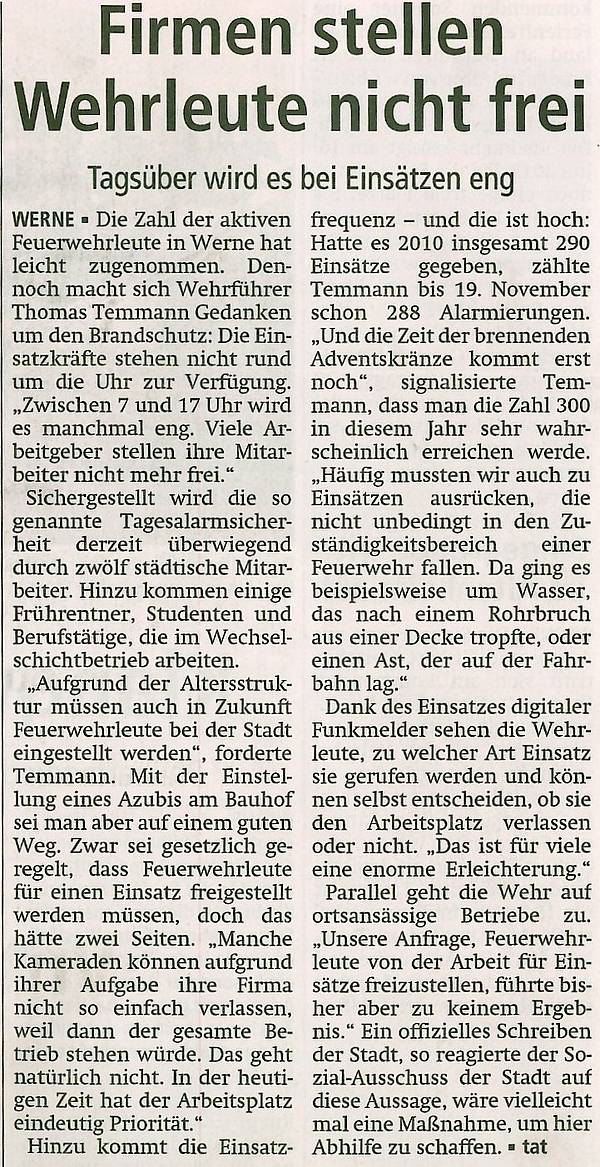 Wehrführer StBI Thomas Temmann sorgt sich einem Bericht des Westfälischen Anzeigers zufolge um die Tageseinsatzstärke seiner Freiwilligen Feuerwehr. Der Grund: Die Unternehmen stellen die Arbeitskräfte nicht mehr für ehrenamtliche Zwecke frei.