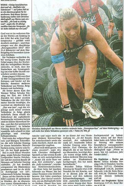 Heute berichtet der Westfälische Anzeiger über die Werner TeilnehmerInnen beim Strongman Run 2012 am Nürburgring vom vergangenen Wochenende. Neben dem "alten Hasen" Tobias Schulze-Frohning von der Löschgruppe Holthausen (Tobias war zum zweiten Mal dabei) waren diesmal auch Christina "Nina" Abdinghoff, die bessere Hälfte von Markus "Appi" Abdinghoff (Geschäftsführer im Löschzug Mitte) und Joachim "Jockel" Schwede, stellvertretender Löschzugführer im LZ 1 Mitte, dabei. Das Eifelwetter bei kuscheligen 8°C und ordentlich Regen - der Nürburgring heißt ja nicht umsonst "Grüne Hölle"... - schaffte die drei ganz ordentlich. Der Sonntag stand daher auch unter dem Fokus Erholung...