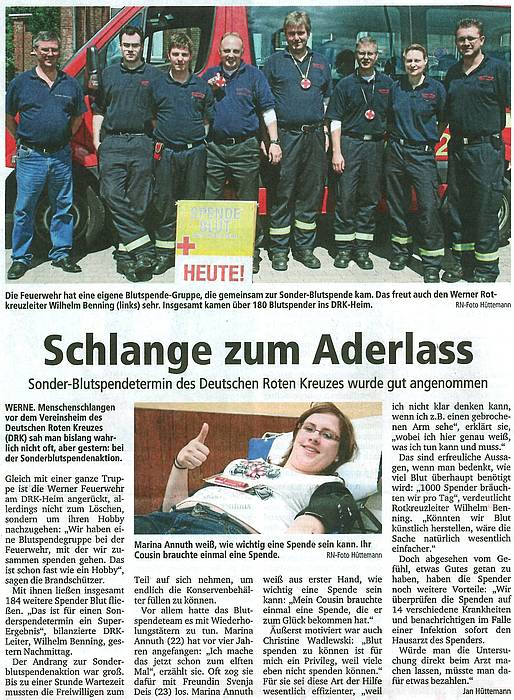 Das schreiben die Ruhr Nachrichten in Ihrer Montagsausgabe vom 23.07.2012 zum Blutspendetermin: