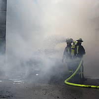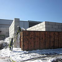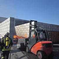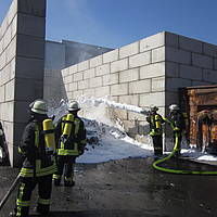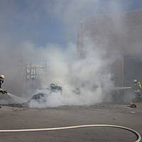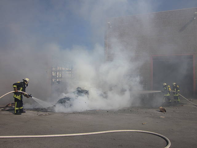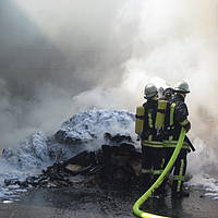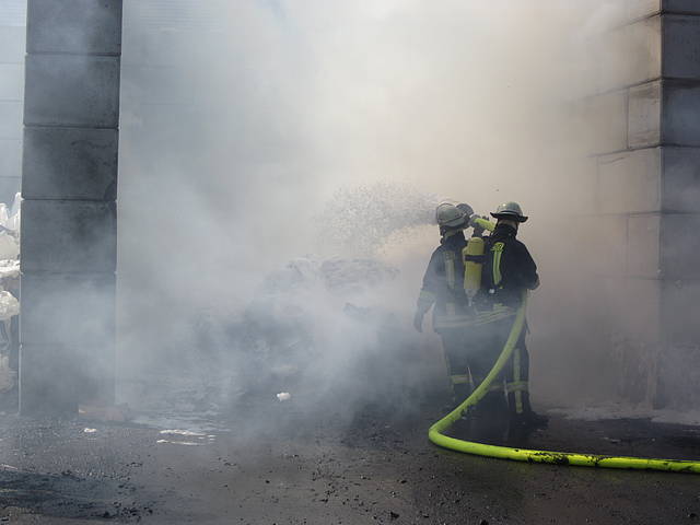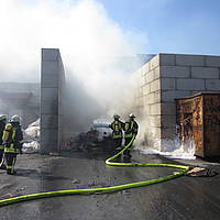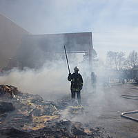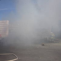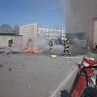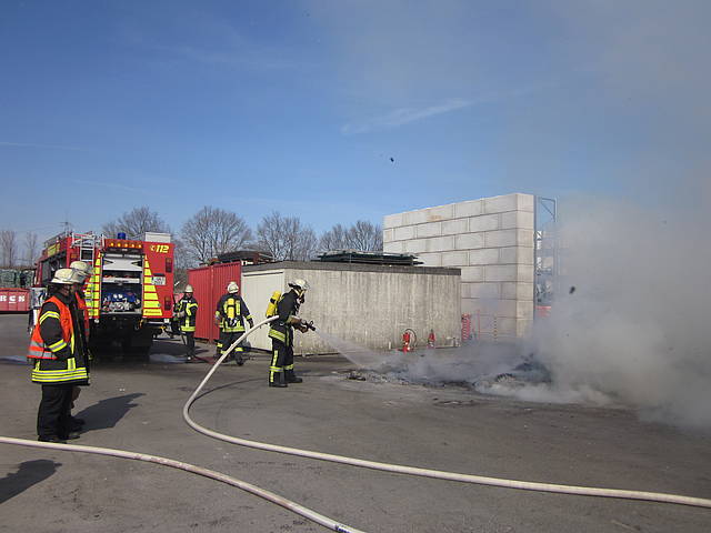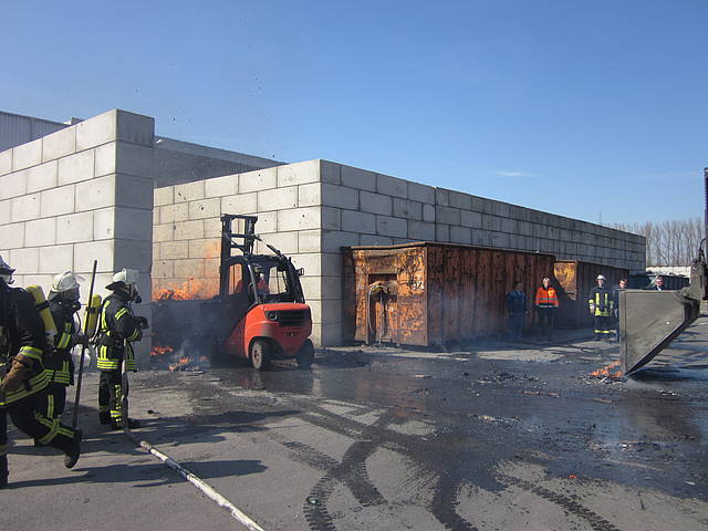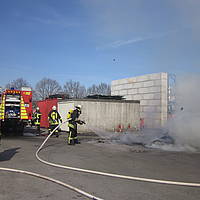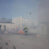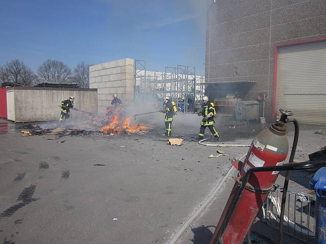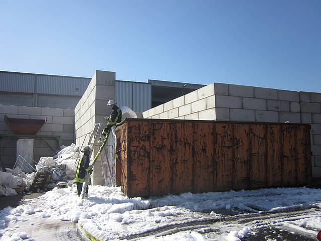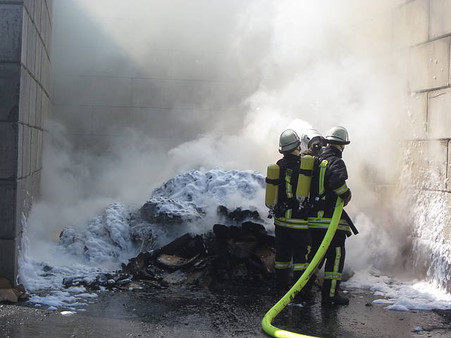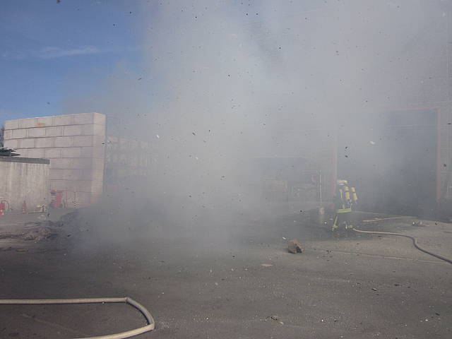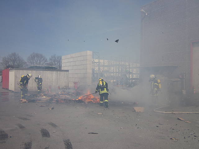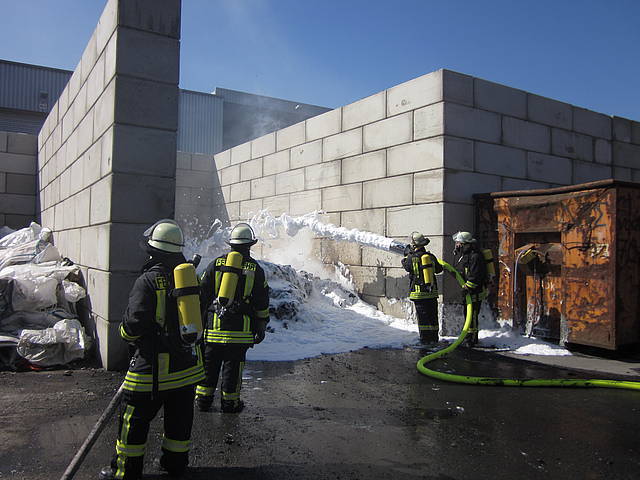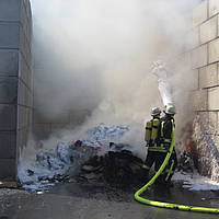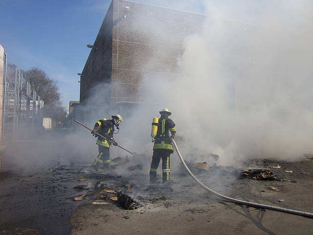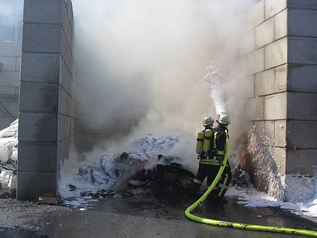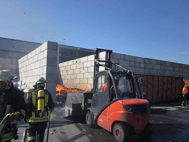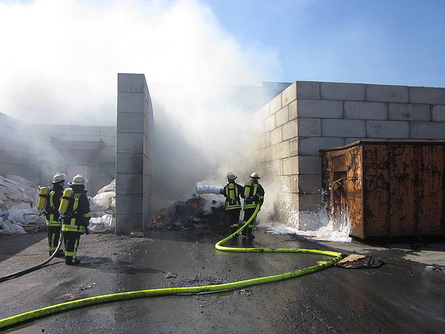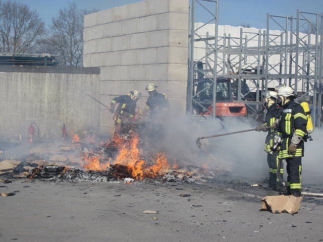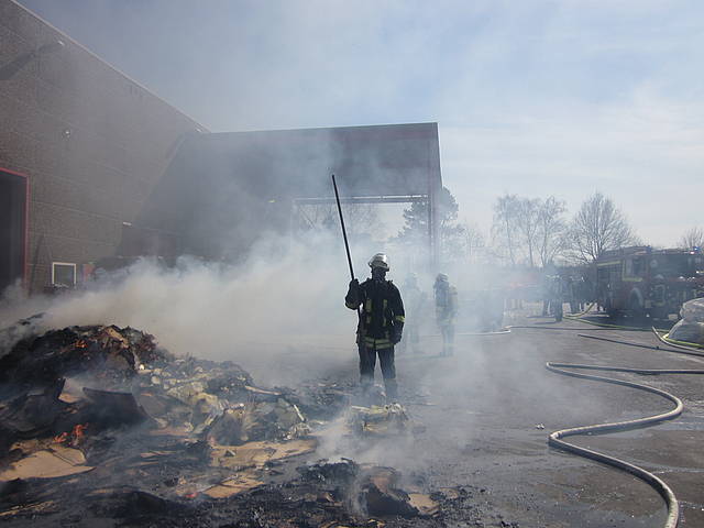 Um 12:28 Uhr ging dann die Meldung ein, dass bei der Entsorgungsfirma RCS Presspappe in Brand geraten sei. Rund 20 Kubikmeter Papier und Pappe hatten aus unekanntem Grund Feuer gefangen. Die Mitarbeiter der Firma RCS schoben das brennende Papier in einen weniger gefährlichen Bereich, wo zwei Trupps unter Atemschutz mit den Löscharbeiten begannen. Ein Dieseltank in der Nähe musste eine Weile gekühlt werden. Nachdem die größten Flammen niedergeschlagen waren, wurde die teils noch brennende Presspappe in einen Bunker geschoben und mit Mittelschaum abgedeckt. Dazu wurde ein Metallkontainer vor den Bunker geschoben, um den Schaum im Bunker zu halten. Um 14:10 Uhr konnte der Einsatz mit der Übergabe der Einsatzstelle an die Betreiber beendet werden. Insgesamt waren 35 Einsatzkräfte der Löschgruppe Holthausen und des Löschzugs Mitte im Einsatz.