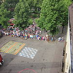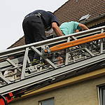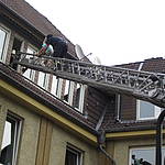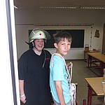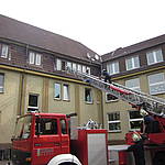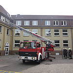 Um Punkt 9:00 Uhr wurde der Alarm ausgelöst. Aber schon aus der exakten Uhrzeit konnte man ableiten, dass es sich "nur" um die jährliche Schulübung handelte. Und fast alles ist auch perfekt abgelaufen. Als die Freiwillige Feuerwehr Werne eintraf, standen alle Schülerinnen, Schüler, Lehrerinnen und Lehrer auf dem Sammelplatz am "Waschgraben". Perfekt. Sieht man von dem ein oder anderen Fenster ab, das noch offen stand, hatten sich alle "retten" können. Bis auf einen Schüler, den die Feuerwehr spaßeshalber per Drehleiter aus dem Dachgeschoß befreite.