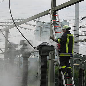 Beim Eintreffen war schon ein Mitarbeiter der Firma Westnetz vor Ort. Nachdem der Mitarbeiter die Leitung um den Kombiwandler geerdet hatte, konnte die Feuerwehr mit den Löscharbeiten beginnen.