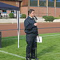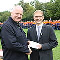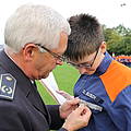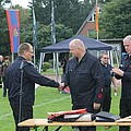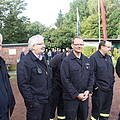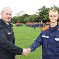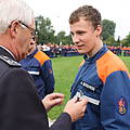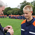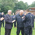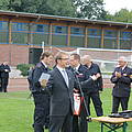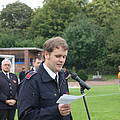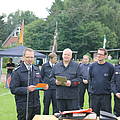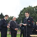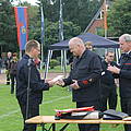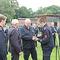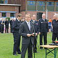 Bürgermeister Christ lobte alle Jugendlichen für ihr Engagement und die Leistungen. Zudem gratulierte er der Jugendfeuerwehr Werne zu ihrem Jubiläum. Das Geschenk in Form eines Briefumschlags (vermutlich mit Inhalt) wurde Ulrich „Ulli“ Große-Drenkpohl überreicht. Auch Thomas Temman als Stadtbrandinspektor und Leiter der Werner Feuerwehr schloss sich den Gratulationen und guten Wünschen an. Kreisbrandmeister Ulrich Peuckmann zeichnete danach Ulrich Große-Drenkpohl gemeinsam mit dem stellvertretenden Landesjugendfeuerwehrwart Peer Grieger mit der Ehrennadel in Silber des Landesjugendfeuerwehrverbandes aus. Diese hohe Auszeichnung hatte sich Ulli durch sein großes Engagement seit Bestehen der Jugendfeuerwehr Werne verdient.