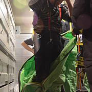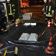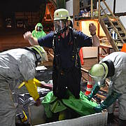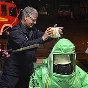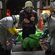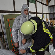 In der Zwischenzeit wurde auf der anderen Seites des Hofs ein Fahrzeug präpariert, in dem ein defektes Packstück mit einer simulierten Flourwasserstoffsäure-Schwefelsäure-Mischung (UN 1786) zu Schaden gekommen war. Ein wenig der Flüssigkeit war ausgelaufen und musste in einen Stahlbehälter umgepackt werden.