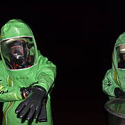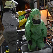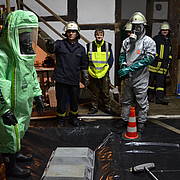 Dazu stiegen zwei Kameraden in einen Chemikalienschutzanzug (CSA), was vor der gesamten Gruppe demonstriert wurde. Der Dekon-Platz wurde besetzt und schon ging die Übung los. Die Erkundung konnte erfolgreich abgeschlossen werden, der Stoff wurde von der Leitstelle korrekt identifiziert und die Bergung eingeleitet. Als kleine Anekdote am Rande entdeckte der Angriffstrupp plötzlich noch eine Person im Fahrzeug und wollte diese gleich retten. Die Übungsleitung klärte jedoch auf, dass es sich lediglich um einen Fotografen handelte, der in Form von Johann Schulze-Frohning das Geschehen mit den untenstehenden Bildern festgehalten hatte.