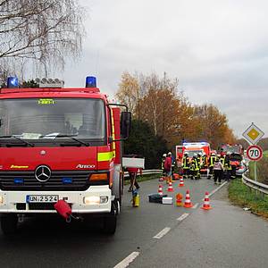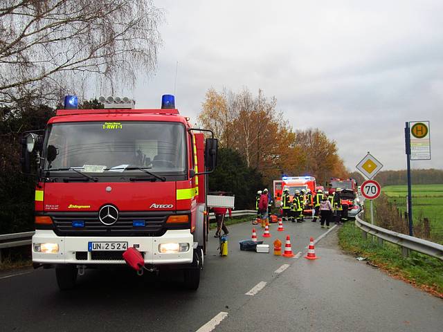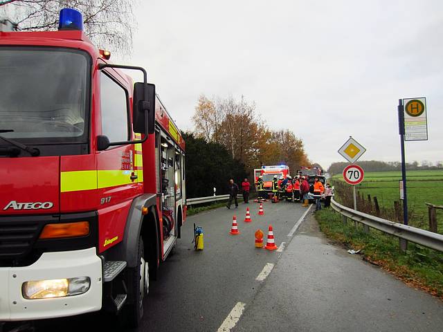 Auf der Heberner Straße in Höhe des Nordbecker Damms wurde eine junge Frau gegen 14.00 Uhr in ihrem Kleinwagen eingeklemmt und musste von der Feuerwehr mit hydraulischem Rettungsgerät befreit werden. Die Fahrerein war auf der engen Landstraße mit einem entgegenkommenden LKW zusammengestoßen und vor einer Leitplanke stehen geblieben. Nachdem die Einsatzkräfte der Löschzüge Stadtmitte und Stockum die Fahrertür entfernt hatten, konnte die Frau patientengerecht befreit und an den Rettungsdienst übergeben werden. Die Straße wurde für die Dauer der Rettungsarbeiten komplett gesperrt. Im Einsatz waren rund 20 Kräfte der Feuerwehr Werne, ein Rettungswagen, der Notarzt und die Polizei. Der Einsatz konnte nach rund 45 Minuten beendet werden.