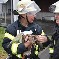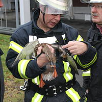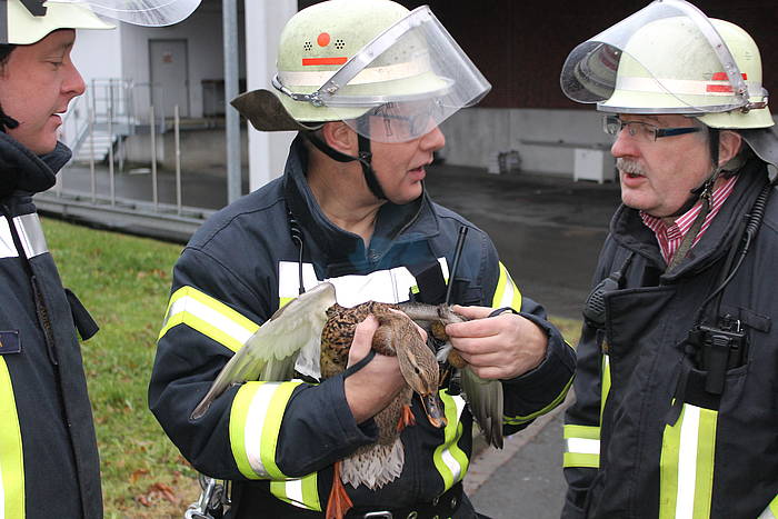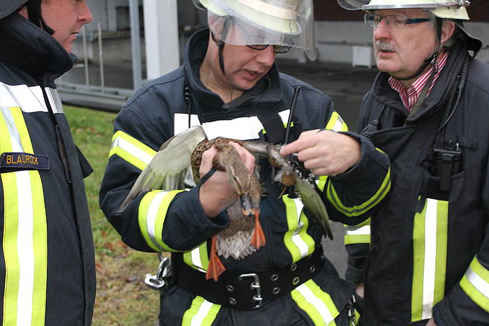 Um 9:24 Uhr wurde der LZ 1 Stadtmitte der Freiwilligen Feuerwehr Werne zu einer Tierrettung alarmiert. Eine Ente hatte sich mit dem Flügel in den Zweigen einer Platane am Moormannteich verfangen und hing mit dem linken Flügel fest. Der LZ 1 rückte mit dem Einsatzleitwagen sowie der Drehleiter aus und befreite die Ente zunächst aus dem Geäst. Am Boden konnten dann die Reste des Zweigs, der sich offensichtlich beim „Zusammenstoß“ wegen der schweren Früchte der Platane um den Flügel gewickelt hatte, entfernt werden. Da die Ente den Flügel problemlos bewegen konnte, wurde sie gleich wieder in den Moormannteich entlassen, wo sie gleich schwimmend das Weite suchte. Nach ca. 20 Minuten konnten die Einsatzkräfte wieder an den adventlichen Frühstückstisch zurück.