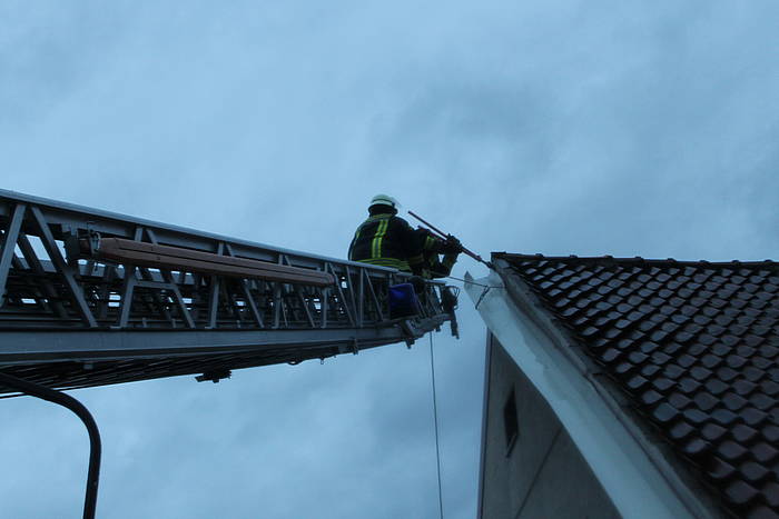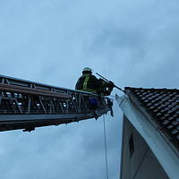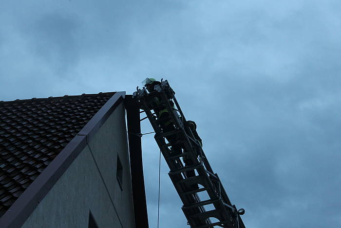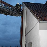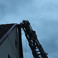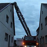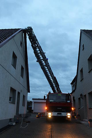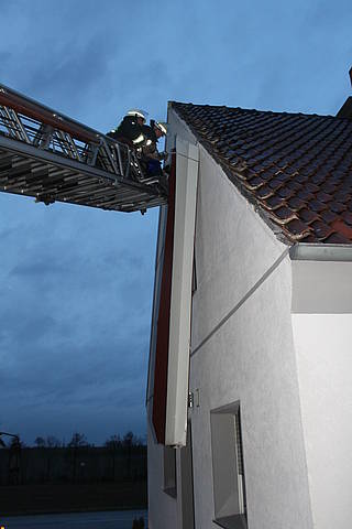 Ein ähnliches Bild ergab sich gegen 16:04 Uhr, als der Löschzug zur Horster Straße alarmiert wurde. Auch hier war eine Dachabdeckung aus Metall betroffen, die sich durch den Sturm gelöst hatte und auf die Fahrbahn zu stürzen drohte. Wiederum über die Drehleiter konnte die Dachabdeckung sicher auf den Boden befördert werden, bevor weiterer Schaden entstehen konnte.