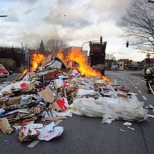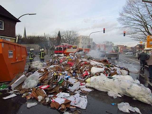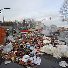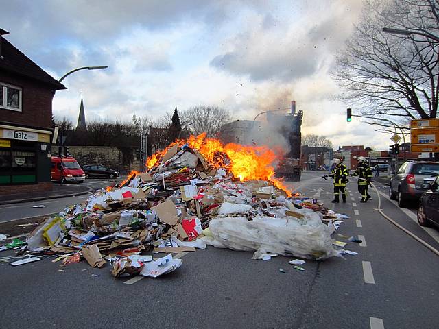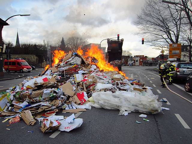 Um 13:40 Uhr wurde der Löschzug 1 der Freiwilligen Feuerwehr Werne zu einem vermeintlichen LKW-Brand auf der Kamener Straße, Ecke Kurt-Schuhmacher-Straße alarmiert. Dort war die Ladung eines Entsorgungsfahrzeugs in Brand geraten. Geistesgegenwärtig hatte der Fahrer die Ladung – Papier und Pappe - kurzerhand auf der Kamener Straße abgeladen und so verhindern können, dass das Fahrzeug in Brand geriet. Die Feuerwehr musste lediglich mehrere Kubikmeter Papiermüll löschen, dabei jedoch die parkenden PKW auf dem Seitenstreifen schützen.