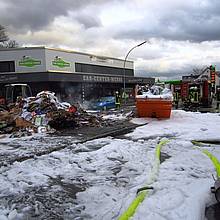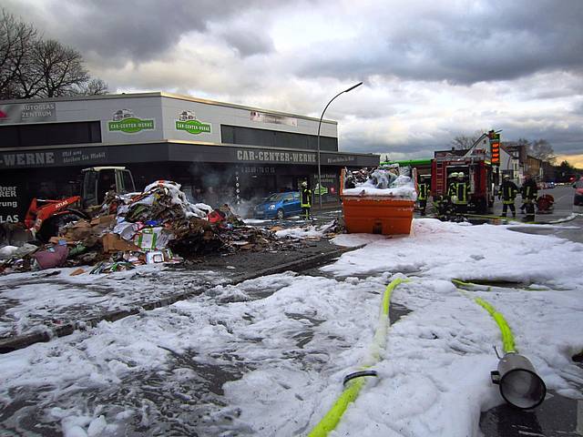 Dazu wurden mehrere Trupps unter Atemschutz mit 3 C-Rohren und einem Schaumrohr eingesetzt. Vom Bauhof Werne wurde ein Radlader geordert, um einerseits das material auseinander zu ziehen und andererseits das abgelöschte Material in einen der vier von einer Privatfirma gelieferten Müllcontainer zu verbringen.