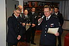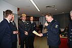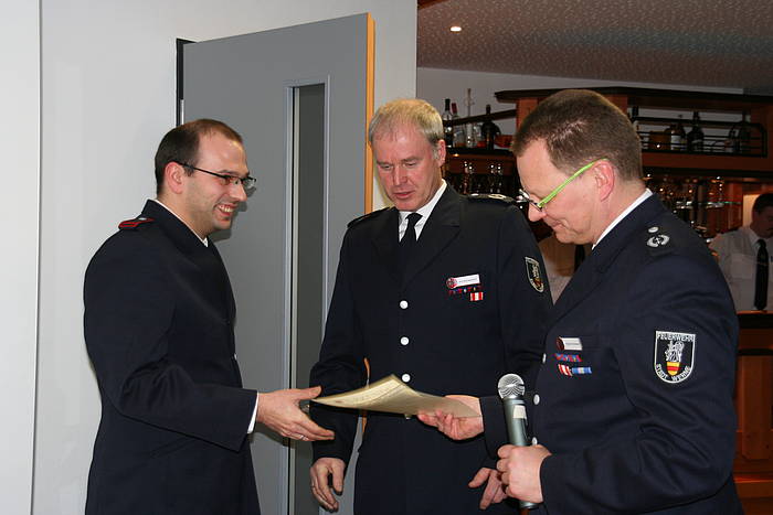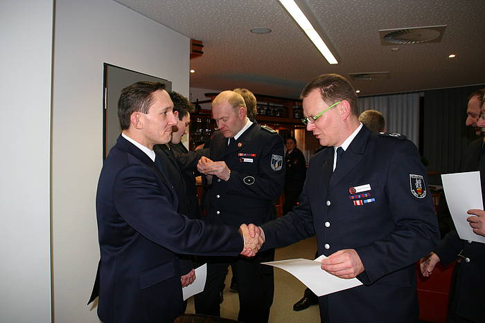 Nach einer Pause zur „Verarbeitung“ der vielen Zahlen in den diversen Berichten kam man dann zum angenehmen Teil der Veranstaltung: Ehrungen und Beförderungen standen auf dem Programm. Aufgrund von absolvierten Lehrgängen oder nach Ablauf einer gewissen Zeit nahm Stadtbrandinspektor Thomas Temmann folgende Beförderungen vor: Benjamin Stein wurde zum Oberfeuerwehrmann befördert. Unterbrandmeister dürfen sich ab sofort Marco Dellwig, Patrik Günnewig und Tobias Westermann nennen. Bele Pohlmann wurde zur Oberbrandmeisterin befördert und denselben Rang hat sich Michael Freundschuh verdient. Axel Kersting wurde zum Hauptbrandmeister, Bodo Bernsdorf zum Brandinspektor befördert.