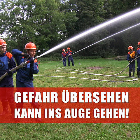 Beide Feuerwehr-Unfallkassen wollen mit der Unfallverhütungsaktion „Das kann ins Auge gehen" die Angehörigen der Jugendfeuerwehren und Feuerwehren erreichen. Ziel ist es, die Gefahr schwerer Augen- und Gesichtsverletzungen, die von einem Löschwasserstrahl ausgeht, zu verdeutlichen. Auf diese Weise soll ein bewussterer Umgang mit Schläuchen und Strahlrohren sowie die Optimierung organisatorischer Abläufe bei Übungen und im Einsatz erreicht werden.