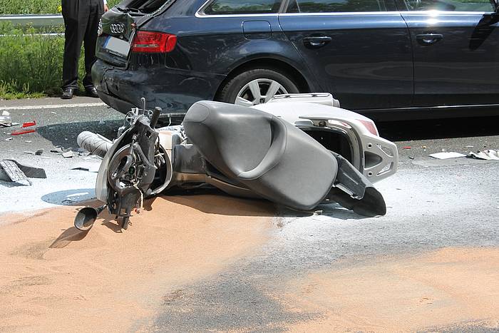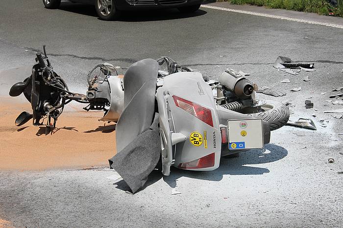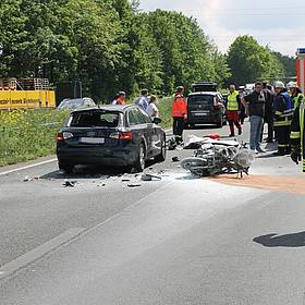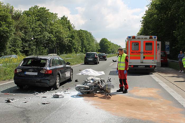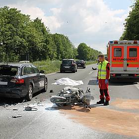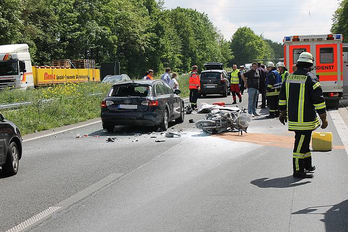 Um 13:44 Uhr wurde die Freiwillige Feuerwehr Werne am heutigen Freitag zu einem Unfall auf der BAB 1 in Fahrtrichtung Köln alarmiert. Anlass war ein brennendes Krad. Der Löschzug 1 rückte mit vier Fahrzeugen und 16 Einsatzkräften aus. Am Unfallort stellte sich heraus, dass ein Kraftrad mit hoher Geschwindigkeit auf ein Stauende aufgefahren und mit einem Audi A6 kollidierte war. Der Kradfahrer verstarb nach dem Aufprall trotz Reanimationsversuchen durch Berufsfeuerwehrleute, die von einem Lehrgang am Institut der Feuerwehr / Münster kamen, noch an der Unfallstelle. Laut Polizeibericht handelte es sich bei dem Toten um einen 62-jährigen Mann aus Dortmund. Der Fahrer des PKW, ein 64-jähriger Mann aus dem Landkreis Cochem/Zell kam mit einem Schock ins Krankenhaus. Der Brand war zwischenzeitlich bereits durch einen Polizeibeamten mit Hilfe eines Pulverlöschers gelöscht worden, so dass die Feuerwehr sich auf Absperrmaßnahmen, die Unterstützung von Rettungsdienst und Polizei sowie nachfolgend die Fahrbahnreinigung konzentrieren konnte.