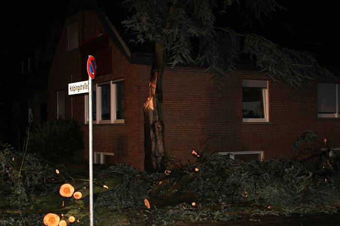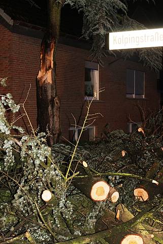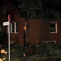 Auf der Lünener Straße in Höhe des Hauses 156 sind mehrere Bäume umgestürzt und haben Strommasten auf ca. 40 Meter Länge umgerissen. Da die Leitung noch unter Spannung steht, wird der Notdienst der RWE verständigt. Die Bewohner von drei Häusern können die Gebäude nicht verlassen, da die Bäume den Weg versperren und Gefahr durch den elektrischen Strom droht. Der Störungsdienst trifft aufgrund der Vielzahl der Notrufe erst ca. 3 Stunden später an der Einsatzstelle ein. Nachdem die Leitung stromlos geschaltet wurde, konnten die Bäume beseitigt werden. Der Einsatz dauerte bis ca. 05.00 Uhr.