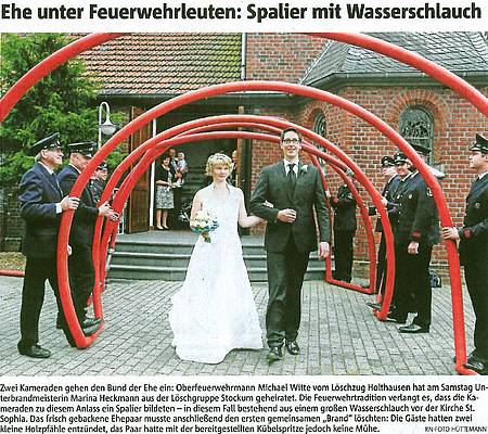 Nein, natürlich haben nicht zwei Feuerwehren geheiratet! Aber nachdem im letzten Jahr zwei Kameraden unter die Haube gekommen sind, berichten die Ruhr Nachrichten in ihrer heutigen Ausgabe über ein besonderes Ereignis: Unterbrandmeisterin Marina Heckmann vom Löschzug Stockum heiratete zum Mitsommer am vergangenen Samstag (21.06.2014) ihren Oberfeuerwehrmann Michael Witte von der Löschgruppe Holthausen. Ob die Dienstgrade auch etwas über die Verhältnisse in der Beziehung aussagen, beschreibt der Artikel nicht. Aber zumindest ist beim Feuerwehreinsatz klar, wer den Trupp führt ;-)
