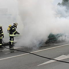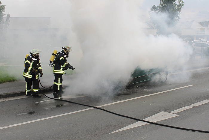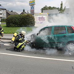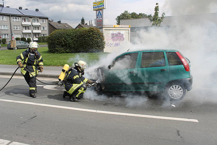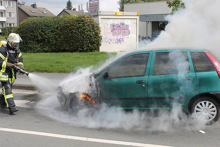 Um 13:17 Uhr wurde am heutigen Freitag der Löschzug 1 der Freiwilligen Feuerwehr Werne zu einem nicht näher bestimmten Feuer alarmiert. Beim Eintreffen auf dem Hansaring wurde klar, dass es sich um einen Fahrzeugbrand handelte. Der Motor des PKW war aus ungeklärter Ursache in Brand geraten und hatte bereits auf die vorderen Räder übergegriffen. Ein Trupp unter Atemschutz löschte das Fahrzeug unter Nutzung eines Schnellangriff-Rohrs. Der Brand war schnell unter Kontrolle und ein Übergreifen der Flammen auf den Innenraum konnte verhindert werden. So wurden zumindest Papiere und Einkauf der Fahrerin gerettet, am Fahrzeug entstand jedoch Totalschaden.