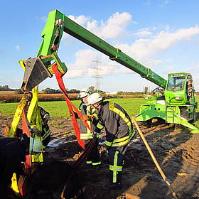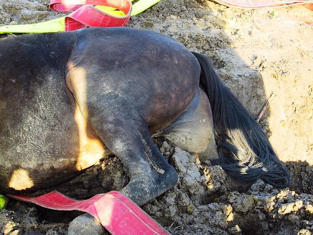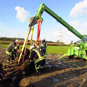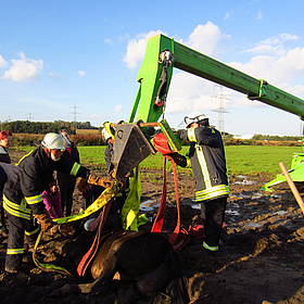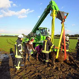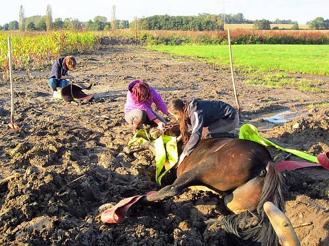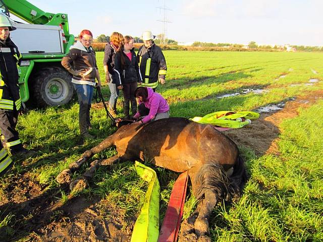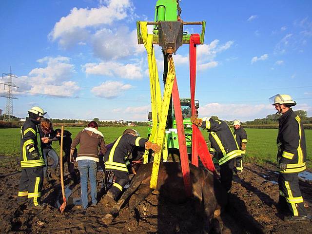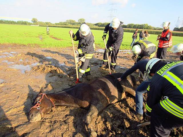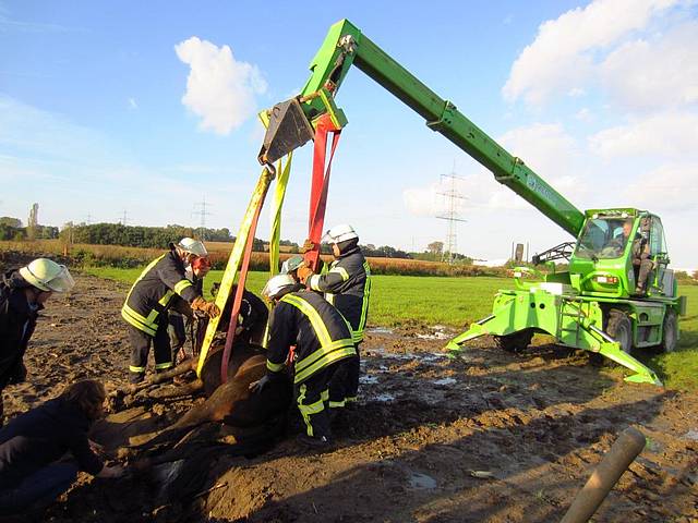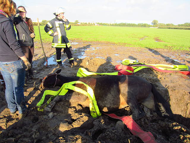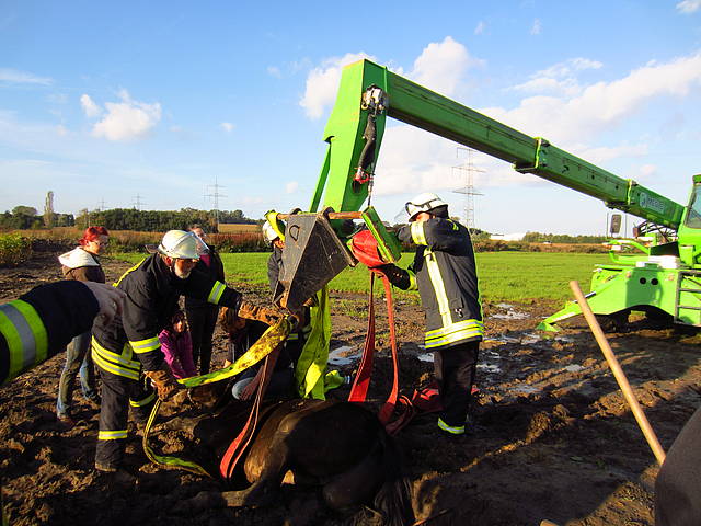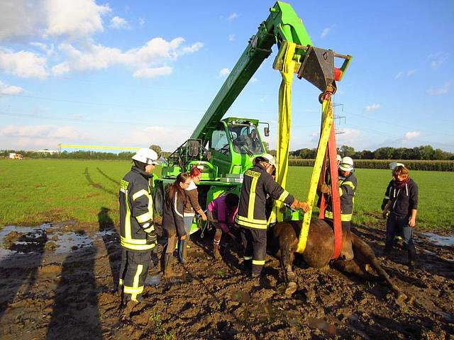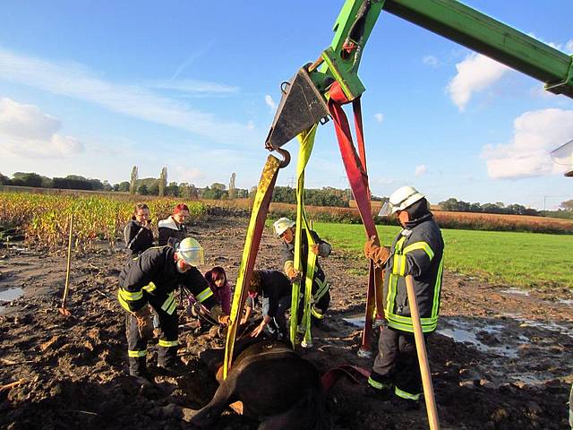 Nachdem das Pferd von der Tierärztin ruhig gestellt war, versuchten die Einsatzkräfte mit Spaten und Schaufeln eine Möglichkeit zu schaffen, Gurte unter dem Tier hindurch zu ziehen. Dies gelang nach einer Weile unter Mithilfe einiger Reiterinnen von der Hilly-Billy-Ranch, die zur Hilfe geeilt waren. Mit einem Radlader der Firma Sievert, der über einen ca. 12 Meter langen Ausleger verfügt, konnte das erschöpfte Tier langsam aus dem Schlamm bis auf befestigten Untergrund gezogen werden. Nach ca. 30 Minuten richtete sich das Pferd aus eigenen Kräften wieder auf und konnte mit einem Pferdeanhänger abtransportiert werden.