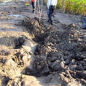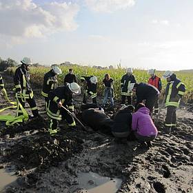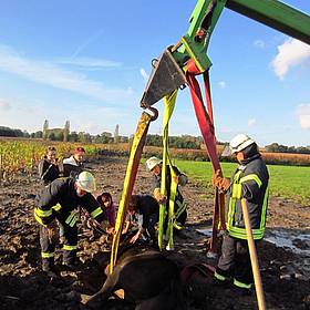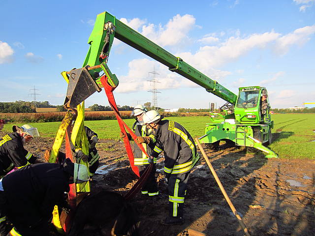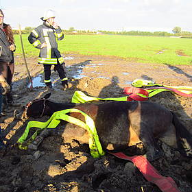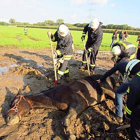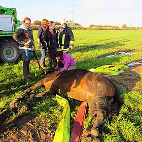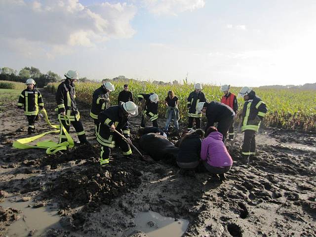 Eine junge Reiterin war gegen 16.30 Uhr mit ihrem Pferd auf einer Wiese am Martinsweg unterwegs, als dort der vom Regen aufgeweichte Boden nachgab und das Pferd im Schlamm versank. Die Reiterin rutschte seitlich vom Pferd und blieb bei dem Sturz unverletzt. Das Reitpferd versank mit den beiden rechten Läufen bis zum Körper im Schlamm und konnte sich aus dieser misslichen Lage nicht mehr befreien. In ihrer Not alarmierte die junge Dame die Feuerwehr. Die Rettungsleitstelle löste daraufhin um 16.48 Uhr die Melder der Löschgruppe Langern und des Löschzuges Stadtmitte aus, die mit mehreren Fahrzeugen zum Martinsweg ausrückten. Die Unfallstelle war nur über einen längeren Fußweg zu erreichen, da der Untergrund mit Fahrzeugen nicht befahrbar war.
