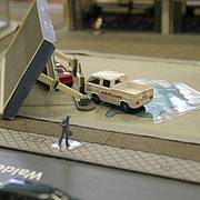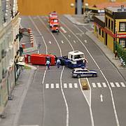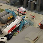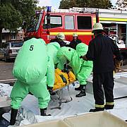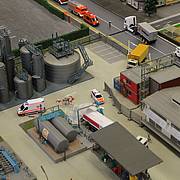Auf diese Art übten heute 13 Kameraden den Ernstfall, acht davon mussten Varianten des beschriebenen Ablaufs durchstehen. Mit ihren drei Ausbildern starteten die Einsatzkräfte am Morgen mit einem Theorieblock, in dem zunächst der Aufbau einer Dekontamination besprochen wurde. Danach erfolgte ein sogenanntes „Planspiel“, bei dem anhand von drei Übungsszenarien – nachgestellt auf Modell-Eisenbahnplatten am Institut der Feuerwehr n Münster - je ein Einsatzleiter seine potentiellen Maßnahmen vorstellte. Eine Lage stellte einen Verkehrsunfall zwischen einem LKW und einem Transporter nach, bei dem der Transporter seine strahlende Ladung aus Kobalt 60 verloren hatte. Eine zweite Lage entspann sich um eine bei der Beladung eines Tanklastzuges abgerissene Produktleitung, aus der massiv Aceton ausströmte und sechs Personen verletzte. Die letzte Szene stellte einen Unfall auf einer Tankstelle dar, in dem ein Fahrer durch die Folgen eines Herzinfarktes eine Zapfsäule beschädigte und Ottokraftstoff ausströmte. Durch die hohe Außentemperatur von 31 °C mit einer erheblichen Explosions-Gefahr verbunden.