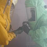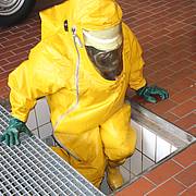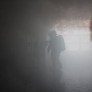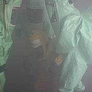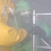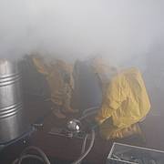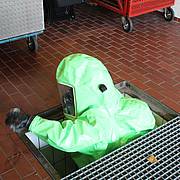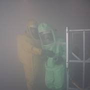 Das Alles ist ein Übungsszenario und spielt in der mit Diskonebel verrauchten Waschhalle der Freiwilligen Feuerwehr Werne am Konrad-Adenauer-Platz. Aber die Übung hat es in sich. Der Trupp muss zunächst durch eine Grube klettern, um zum Eingang der „Produktionshalle“ zu gelangen. Der Diskonebel gestattet eine Sicht von maximal einem Meter und die sperrigen CSA sind nicht gerade Wohlfühl-Bekleidung. Aber schließlich findet der Trupp die undichte Produktleitung und versucht das Leck mit Hilfe der Manschette abzudichten. Aber der Übungsleiter verschärft die Situation. Plötzlich erklingt ein „Mayday, Mayday, Mayday!“ aus den Lautsprechern der Funkgeräte. Einer der CSA-Träger ist unter der erheblichen körperlichen Belastung ohnmächtig geworden und zusammen gebrochen. Schon steht der Sicherheitstrupp bereit, um nach dem verunglückten Kameraden zu suchen. Wie immer hat sich der Übungsleiter den größten und schwersten Kameraden als Ohnmächtigen ausgesucht. Aber das ist nicht unbedingt unrealistisch. Denn den 75 Kilogramm schweren Normfeuerwehrmann gibt es eher in den Dienstvorschriften als in der Realität. Und so ist ein Sicherheitstrupp durchaus schon einmal mit 100 und mehr Kilogramm unbeweglicher Ohnmacht konfrontiert, die gerettet werden muss. Mit Mühe schaffen die drei Kameraden es, den Verunglückten aus dem Gefahrenbereich zu retten und ihn nach einer Grobdekontamination dem im Übungsszenario nicht anwesenden Notarzt zu übergeben.