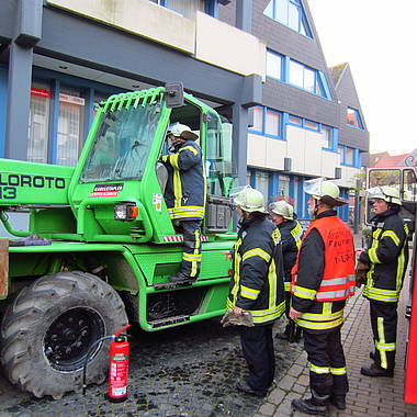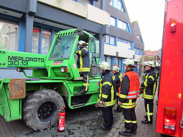 Der Fahrer eines Baggers, der Arbeiten auf dem Markt vor der Stadtsparkasse ausführte, bemerkte heute Morgen wie Qualm aus seinem Armaturenbrett drang. Er stellte sofort den Motor ab und löschte die Flammen mit einem Feuerlöscher. Zwischenzeitlich hatten seine Kollegen die Feuerwehr alarmiert. Der Löschzug Stadtmitte rückte um 08.30 Uhr mit drei Fahrzeugen aus und kontrollierte das Fahrzeug mit der Wärmebildkamera. Sicherheitshalber wurde die Batterie abgeklemmt. Nach rund 15 Minuten war der Einsatz beendet, glücklicherweise wurde niemand verletzt.