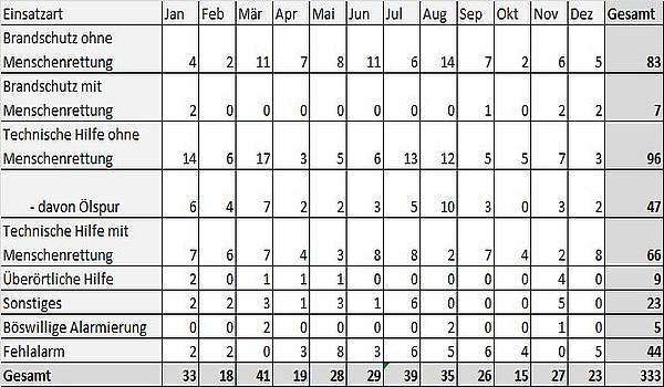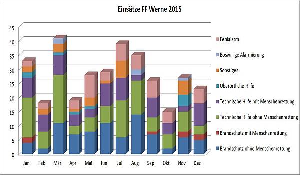 Die Grafiken beziehen sich auf die gesamte Feuerwehr Werne. Die Statistiken lassen sich durch anklicken vergrößern (Hinweis: Daten des laufenden Monats sind vorläufige Angaben):