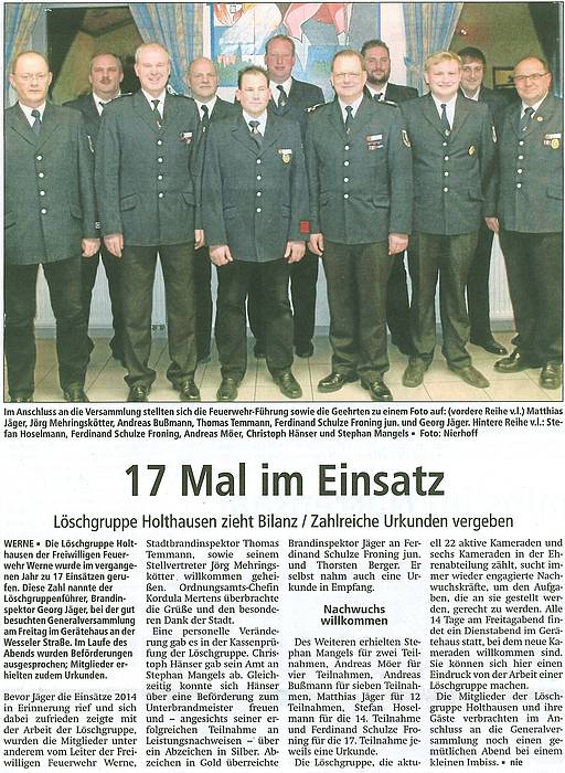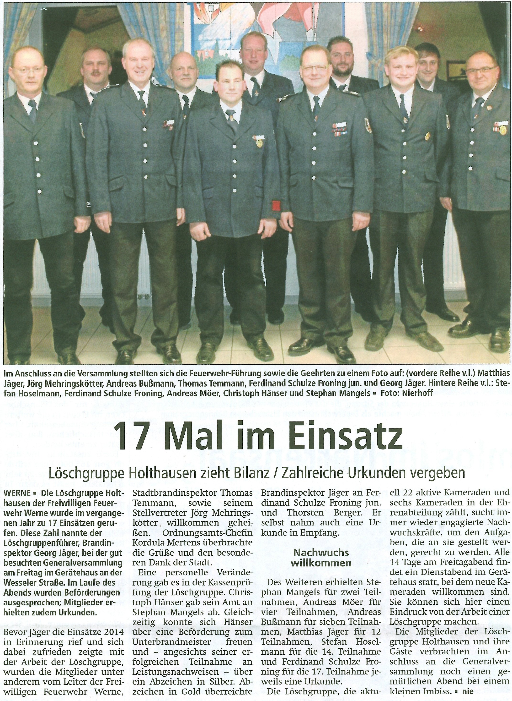 Am vergangenen Freitag (16.01.2015) fand die Jahreshauptversammlung der Löschgruppe Holthausen der Freiwilligen Feuerwehr Werne statt. Der Westfälische Anzeiger berichten in seiner Montagsausgabe über die Fakten: