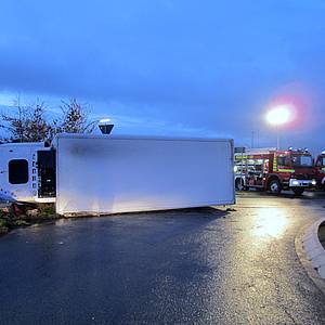 Bei dem Unfall hatte sich ein Schlauch vom sogenannten AdBlue-Tank, ein Diesel-Additiv, gelöst und das Medium trat aus. Die Feuerwehr fing das AdBlue mittels einer Schuttmulde auf und stoppte den Austritt. Nach weiteren Sicherungsmaßnahmen traf gegen 8:45 Uhr ein Abschleppunternehmen ein. Die Einsatzstelle wurde an die Polizei übergeben und die Feuerwehr beendete den Einsatz gegen 8:55 Uhr. Im Einsatz waren 20 Einsatzkräfte und vier Fahrzeuge sowie mehrere Fahrzeuge der Polizei. Der Kreisverkehr wurde für die Bergungsmaßnahmen einseitig gesperrt, die Polizei leitete den Verkehr halbseitig durch den Kreisverkehr ab.