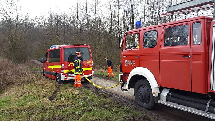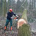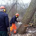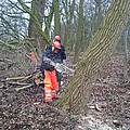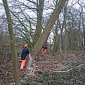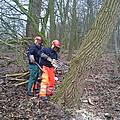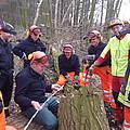 Am Samstag ging es dann in die Praxis. Sowohl Andreas Moer aus Werne als auch Familie Bücker aus Unna hatten einige Bäume in ihren Beständen, die bei den letztjährigen Stürmen in Mitleidenschaft gezogen wurden. Diese Bäume waren optimale Übungsobjekte für die Kameraden der Werner Feuerwehr. Denn hier konnte die praktische Anwendung der erworbenen Kenntnisse bei Fällung und Entastung von Schwach- und Starkholzbäumen erprobt werden. Auch eine Seilzug-unterstützte Fällung wurde demonstriert. Da im wirklichen Leben nicht immer alles perfekt abläuft, wurde zusätzlich ausprobiert, wie hängen gebliebene Bäume doch noch sicher zu Boden gebracht werden können.