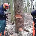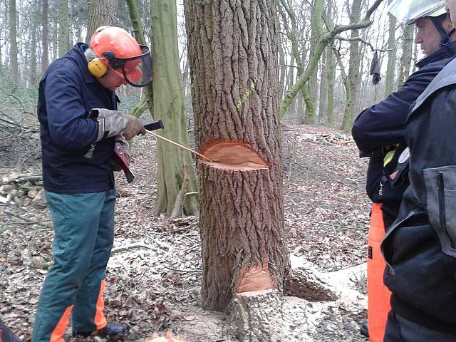 Die notwendigen Kenntnisse wurden nun in einem gemischten Theorie- und Praxis-Lehrgang seitens der Ausbilder Andreas Holtrup und Torsten Ernst vermittelt. Am Freitagabend startete der Lehrgang mit dem Theorieblock, in dem die Feuerwehrleute lernten, unter verschiedenen Witterungs- und Umgebungseinflüssen eine Baumansprache und –beurteilung durchzuführen. Es wurden verschiedene Fälltechniken für Schwach- und Starkholz, die Unterschiede von Laub- und Nadelholz und die Besonderheiten von sogenannten Vor- und Rückhängern besprochen. Wesentlich war auch die Vermittlung der Bedeutung von Fallkerb, Bruchleiste und –kante oder sicherheitsrelevante Themen wie etwa die Einschätzung von Fällbereich und Fällrichtung.