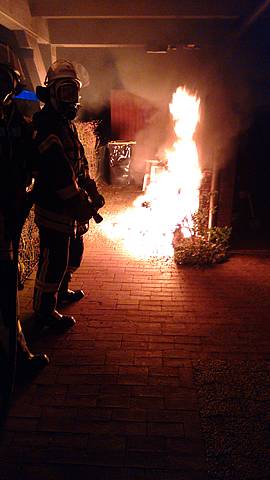 Zunächst aber wurde es hektisch, weil an mehreren Stellen gleichzeitig Brände gemeldet wurden. Um 3:21 Uhr wurde der Brand eines Carports in der Carl-von-Ossietzky-Straße gemeldet. Daher wurden weitere Gruppen sowie der Löschzug Stockum nachalarmiert, um die sich bereits im Einsatz befindlichen Kräfte zu verstärken. Bei Eintreffen aus dem Eick stand der Mülltonne-Unterstand bereits in Vollbrand. Ein Trupp unter Atemschutz löschte die Überreste. Auch hier war die Hausfassade sehr in Mitleidenschaft gezogen worden.