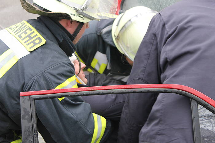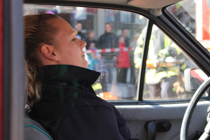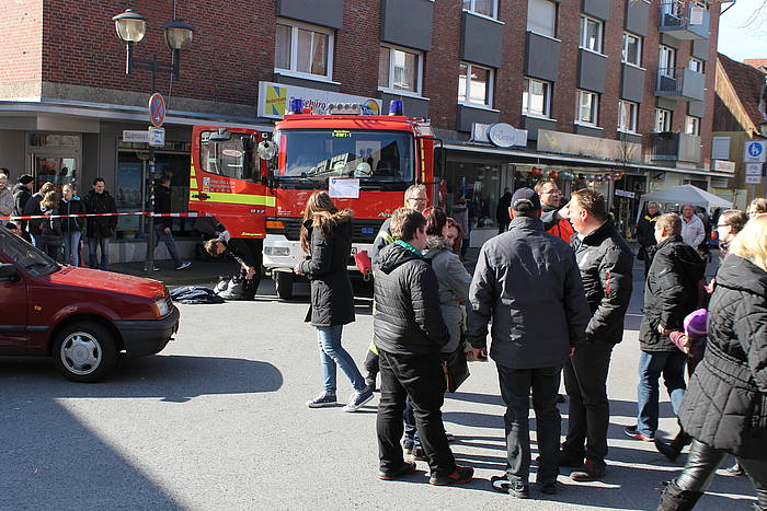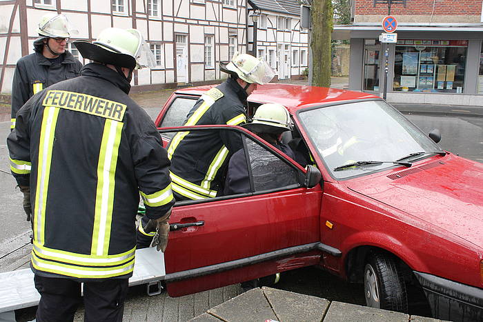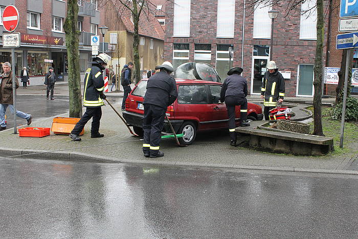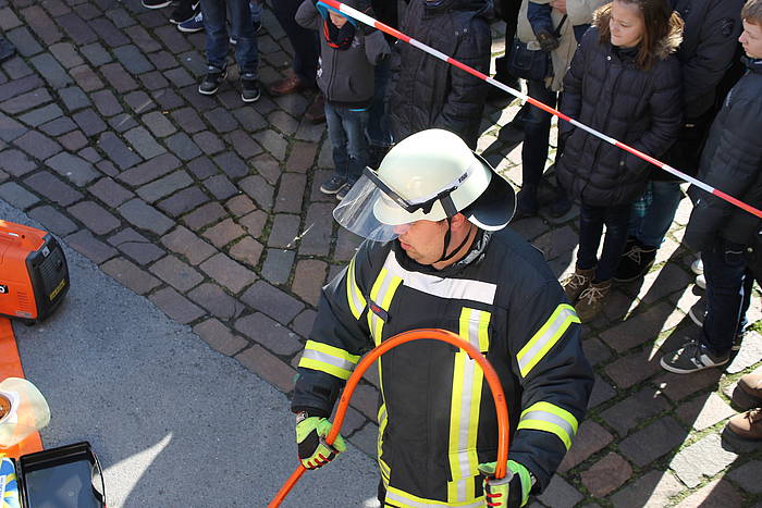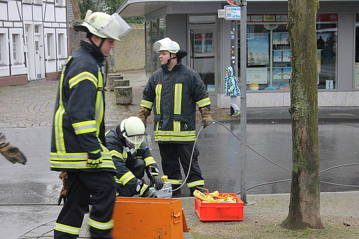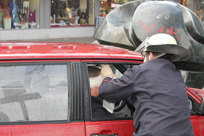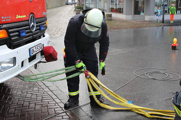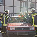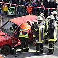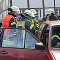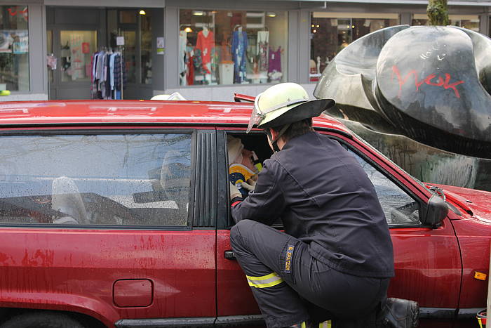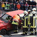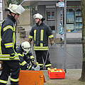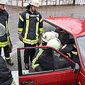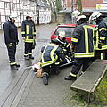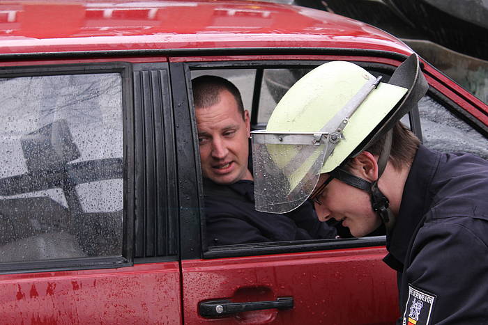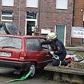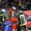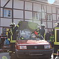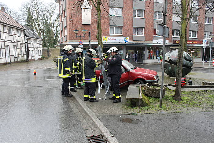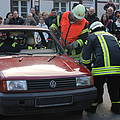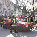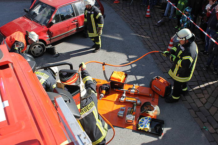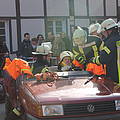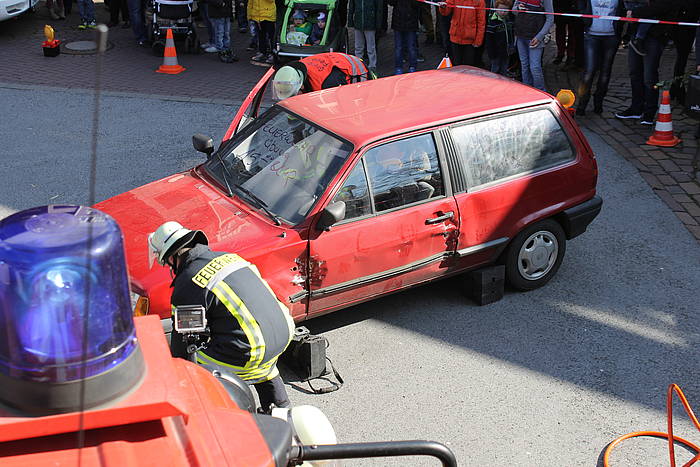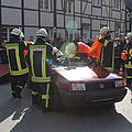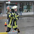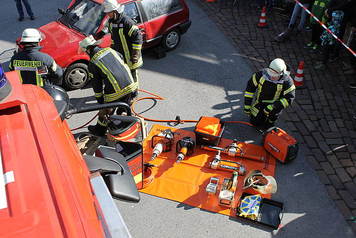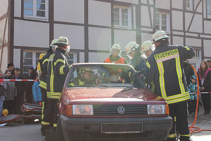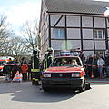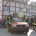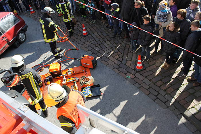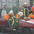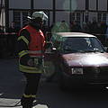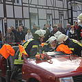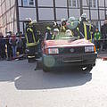 Am Samstag gab es aufgrund des sehr ungemütlich kalten und regnerischen Wetters kaum Resonanz auf das Informationsangebot. Hier wurde dann auch lediglich ein leichte Übung zur technischen Hilfeleistung vor einem versprengten Häufchen von fünf, sechs Zuschauern vorgeführt. Ein PKW hatte sich an einem Brunnen derart festgefahren, dass der verletzte Beifahrer das Fahrzeug nicht selbstständig verlassen konnte. Mittels eines Greifzugs wurde das Fahrzeug aus der "Parklücke" gezogen, so dass die Rettungskräfte den Beifahrer befreien konnten.