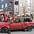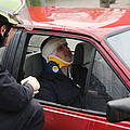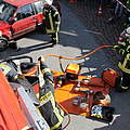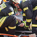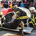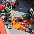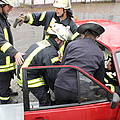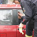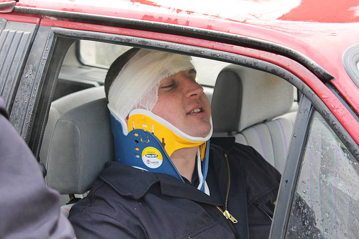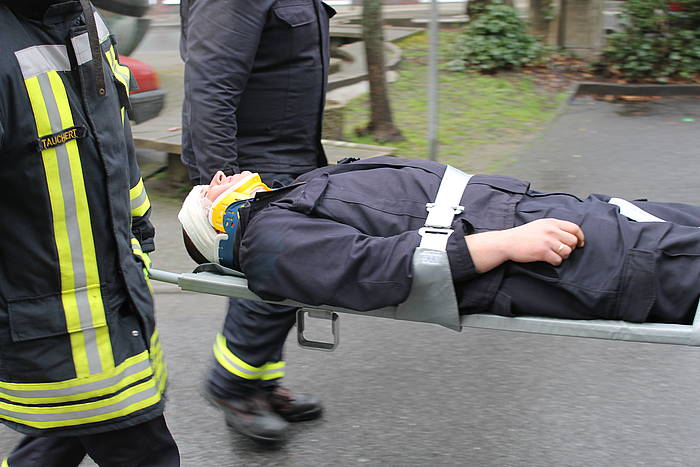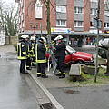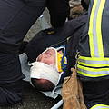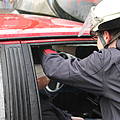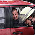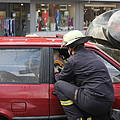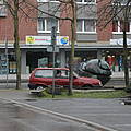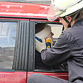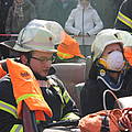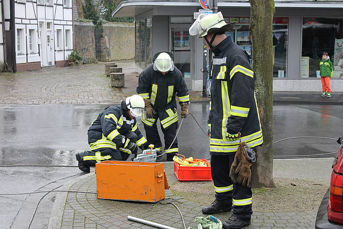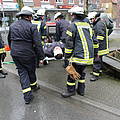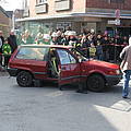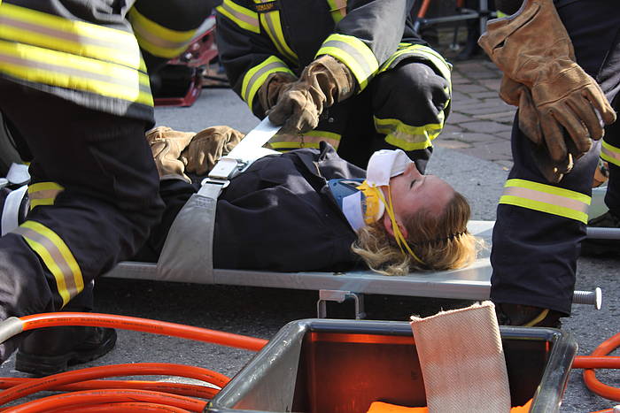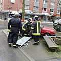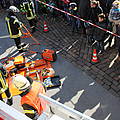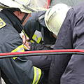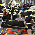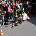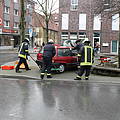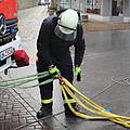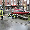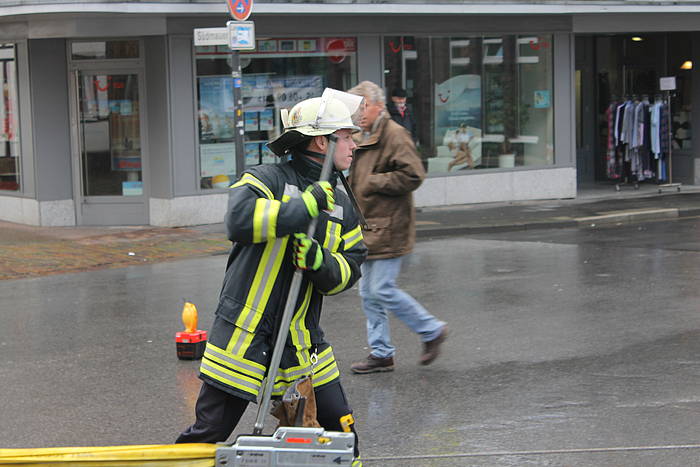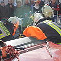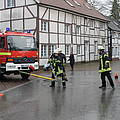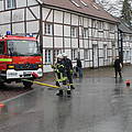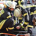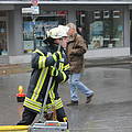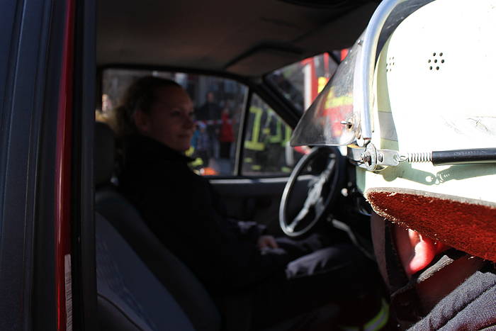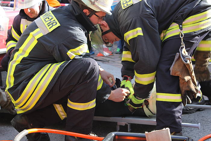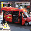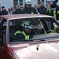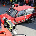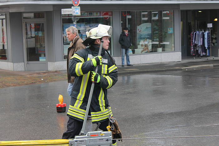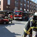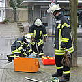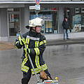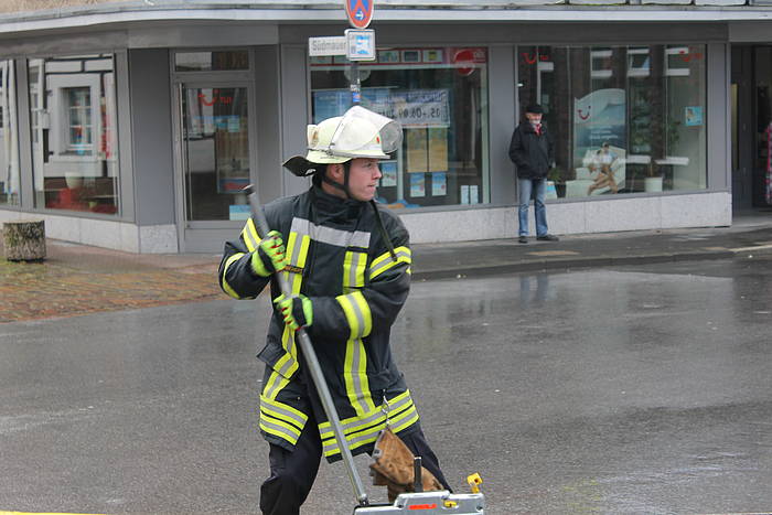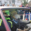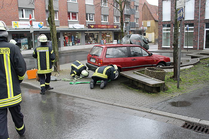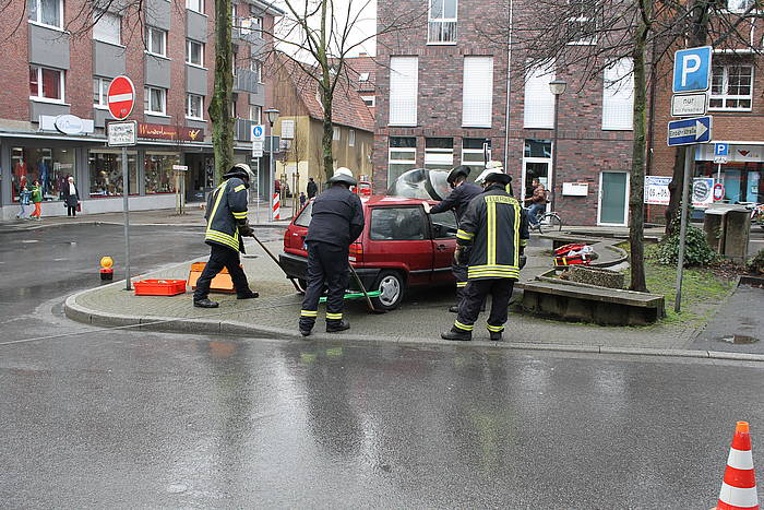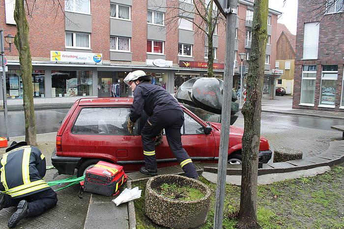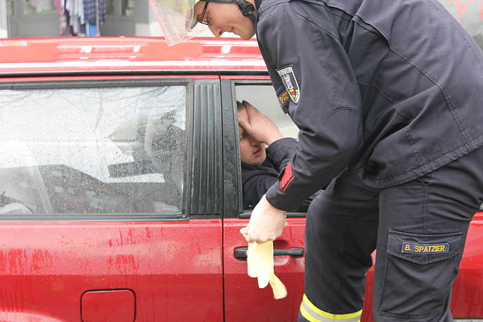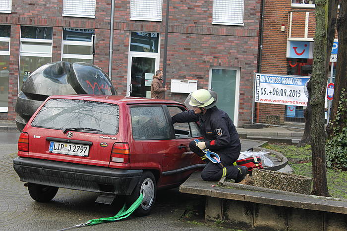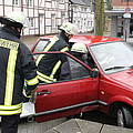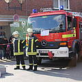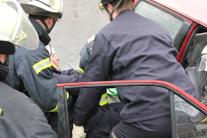 Am Samstag gab es aufgrund des sehr ungemütlich kalten und regnerischen Wetters kaum Resonanz auf das Informationsangebot. Hier wurde dann auch lediglich ein leichte Übung zur technischen Hilfeleistung vor einem versprengten Häufchen von fünf, sechs Zuschauern vorgeführt. Ein PKW hatte sich an einem Brunnen derart festgefahren, dass der verletzte Beifahrer das Fahrzeug nicht selbstständig verlassen konnte. Mittels eines Greifzugs wurde das Fahrzeug aus der "Parklücke" gezogen, so dass die Rettungskräfte den Beifahrer befreien konnten.
