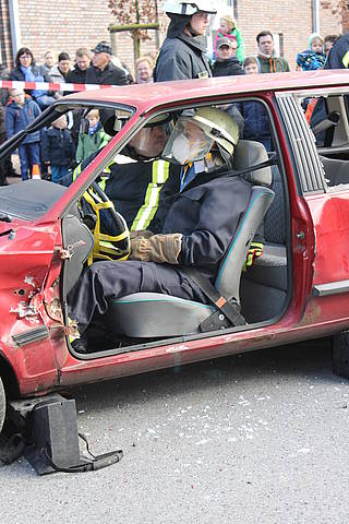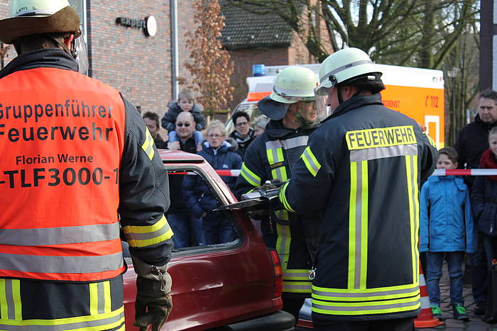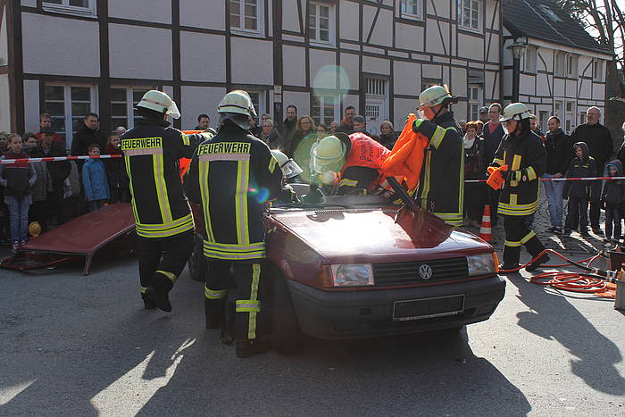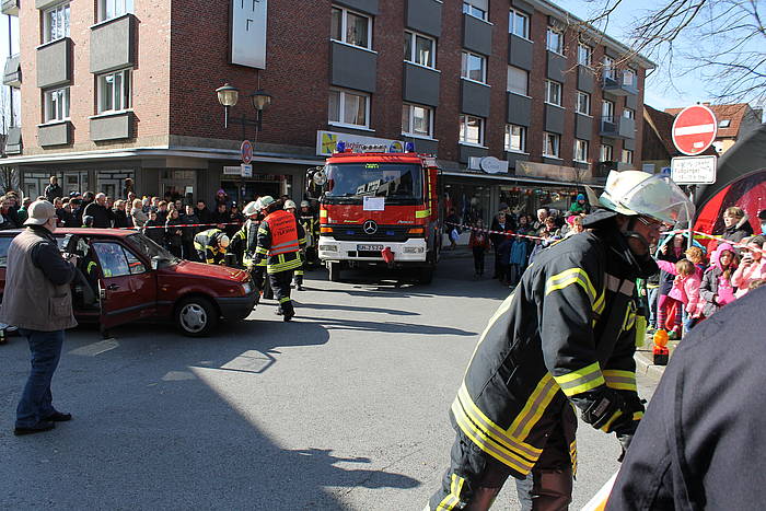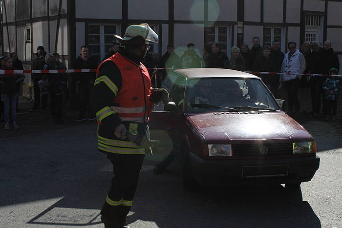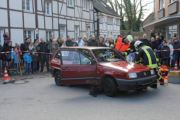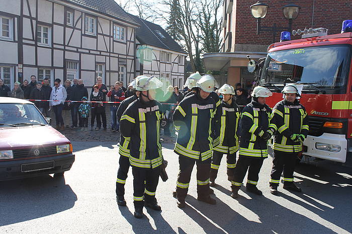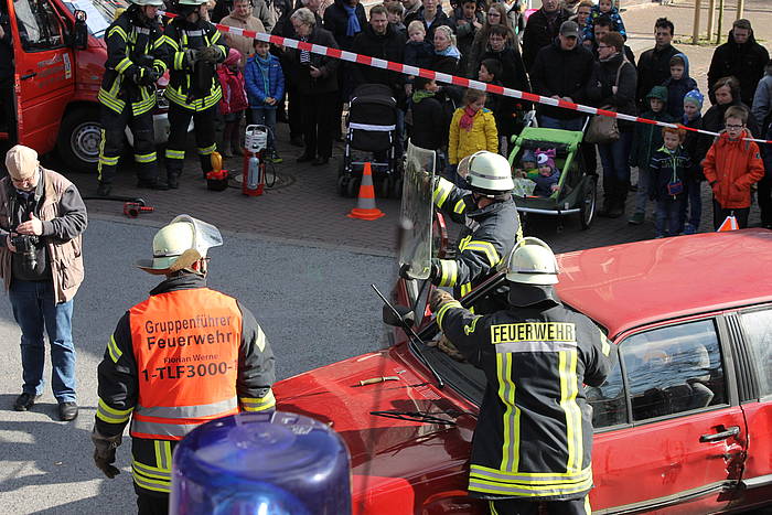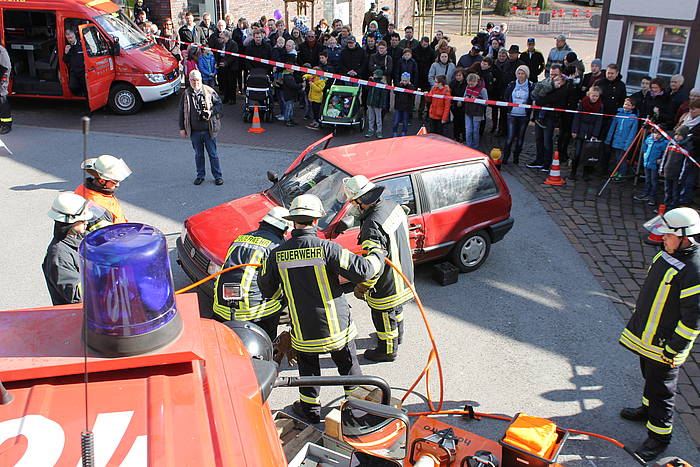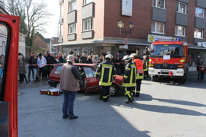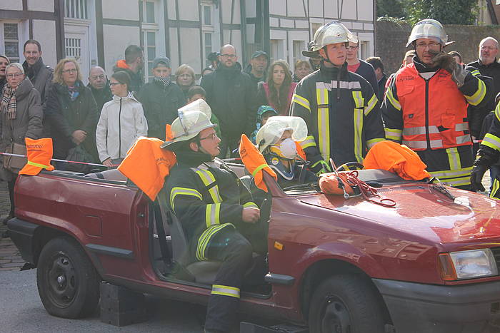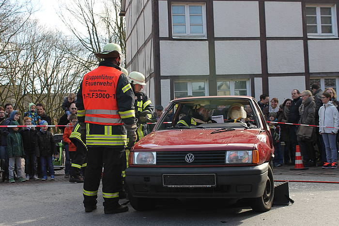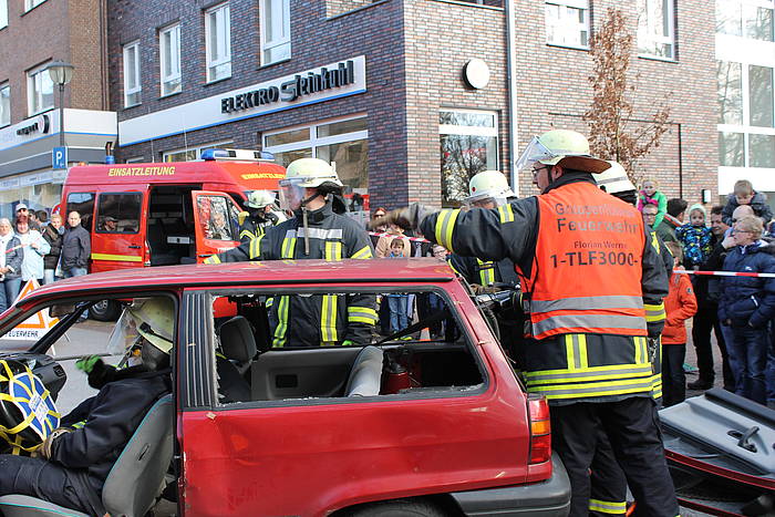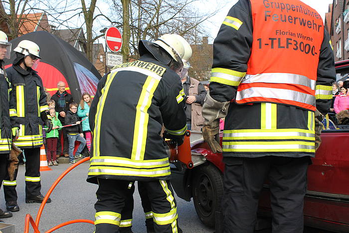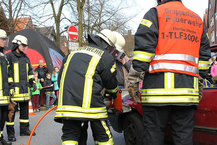 Der Sonntag präsentierte sich aber vollständig anders. Zwar war es immer noch kalt, aber strahlende Sonne und Trockenheit lockten die Gäste wohl aus dem gesamten Umland zu einem Bummel durch die verkaufsoffenen Werner Läden. Auch bei der Feuerwehr war nun einiges los. Um 15:00 Uhr präsentierte man daher eine fachgerechte und nach Feuerwehr-Dienstvorschrift durchgeführte technische Hilfeleistung mit Menschenrettung aus einem verunglückten Fahrzeug. Die Übung wurde über die Lautsprecheranlage des ELW derart kommentiert, dass die Zuschauer jeden der notwendigen Schritte verstehen konnte. Ohne Hektik wurden die Arbeitsschritte durchgeführt und für jeden verständlich erläutert. Diese Übung schaute sich eine durchaus beachtliche Zuschauerzahl an.