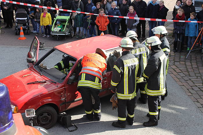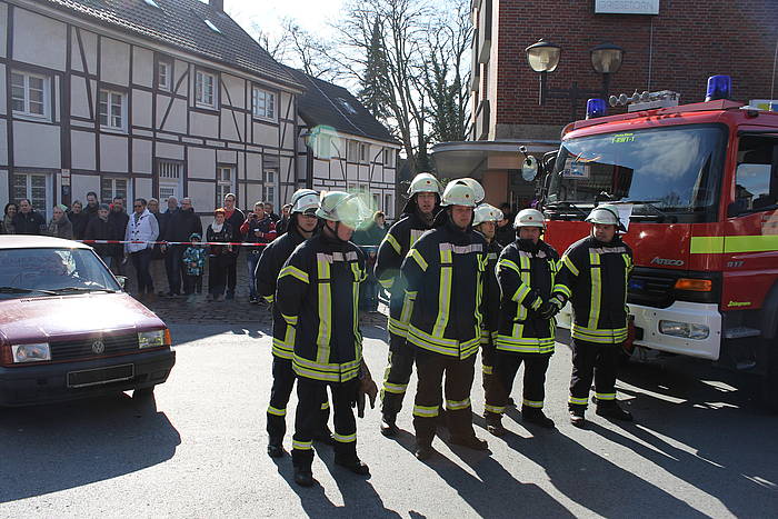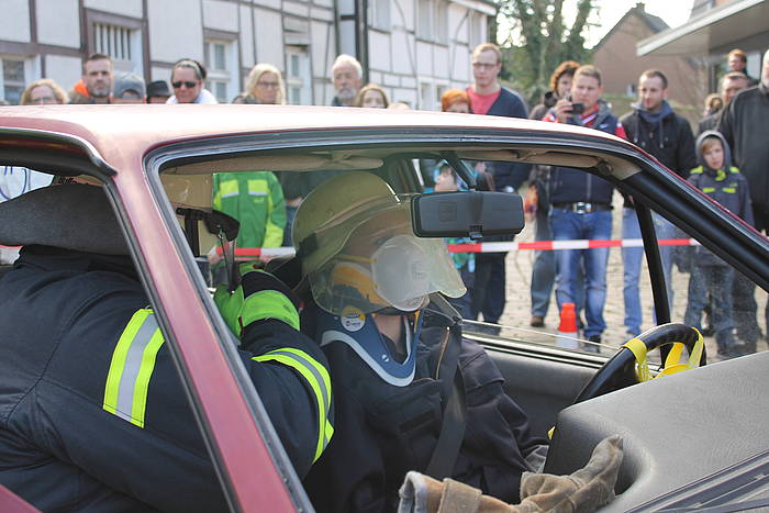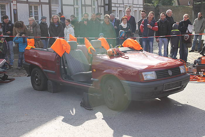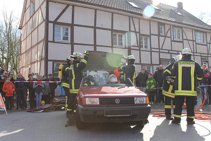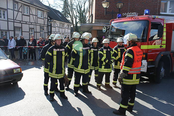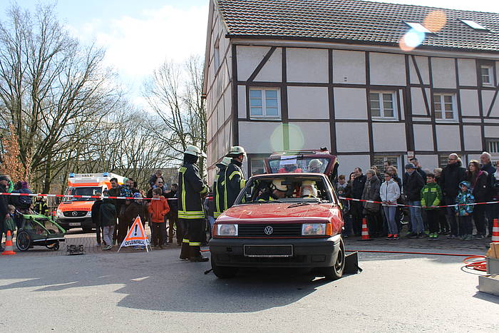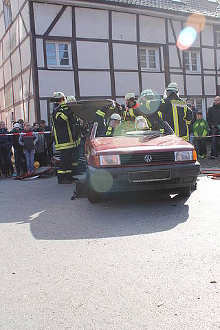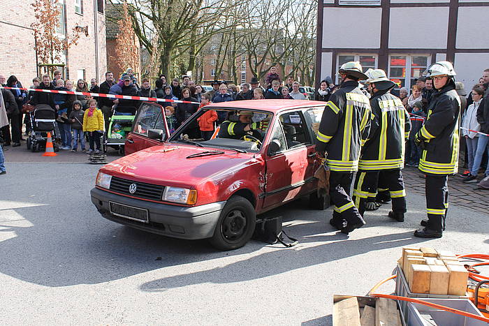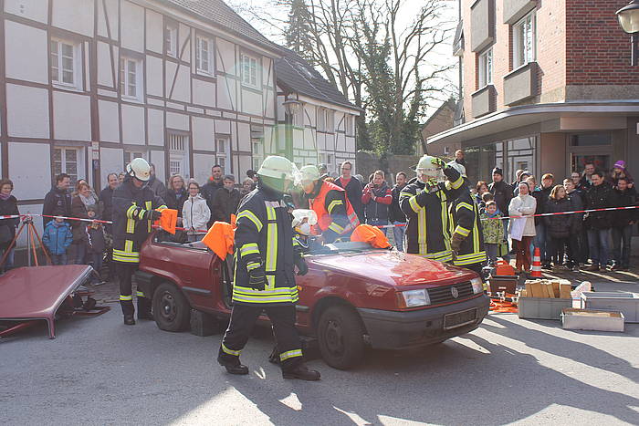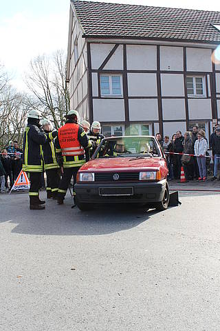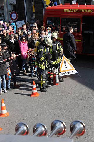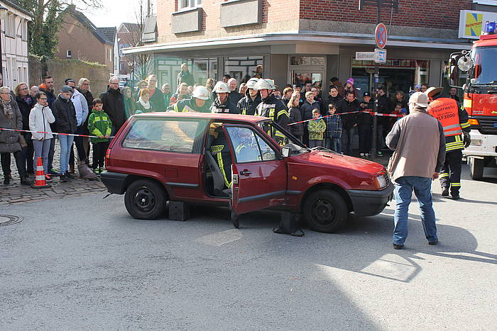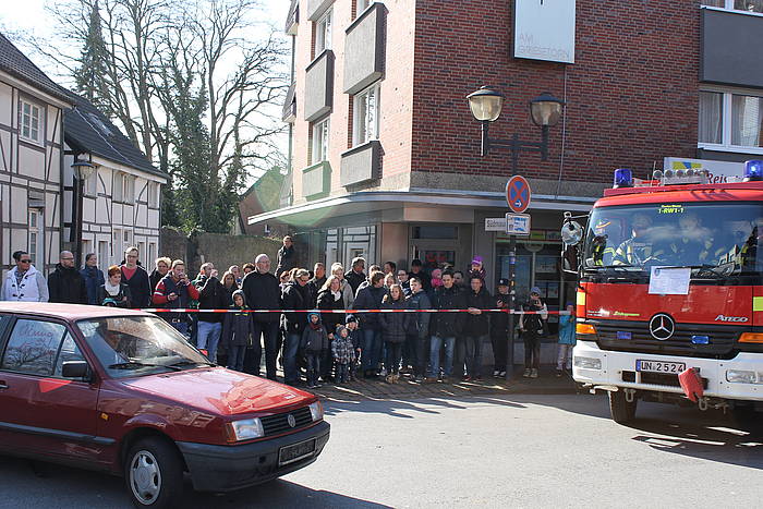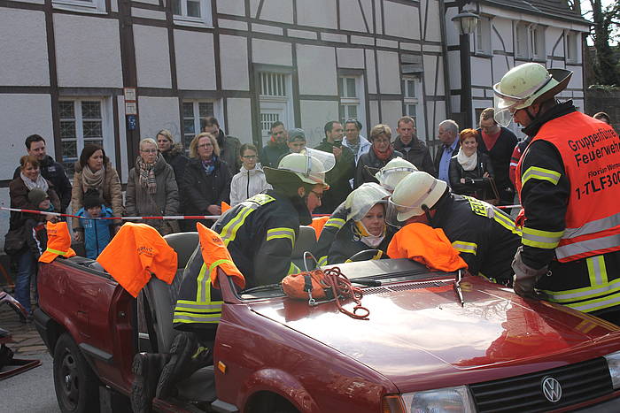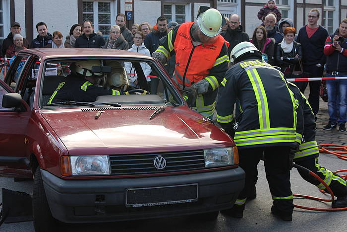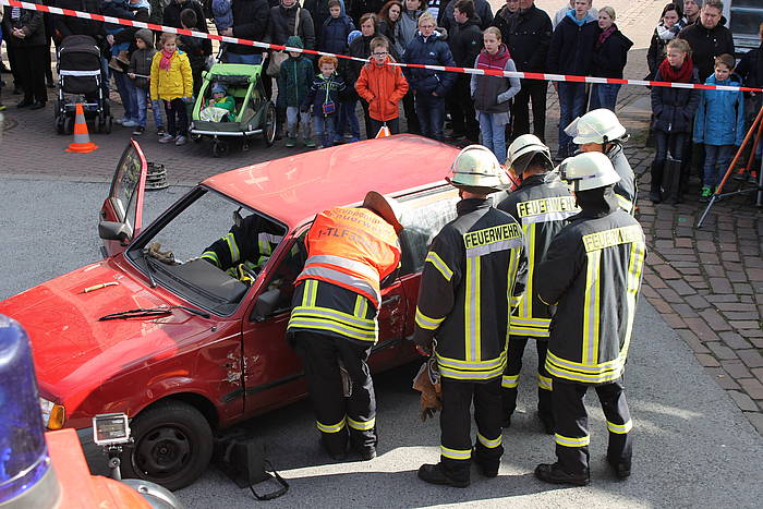 Der Sonntag präsentierte sich aber vollständig anders. Zwar war es immer noch kalt, aber strahlende Sonne und Trockenheit lockten die Gäste wohl aus dem gesamten Umland zu einem Bummel durch die verkaufsoffenen Werner Läden. Auch bei der Feuerwehr war nun einiges los. Um 15:00 Uhr präsentierte man daher eine fachgerechte und nach Feuerwehr-Dienstvorschrift durchgeführte technische Hilfeleistung mit Menschenrettung aus einem verunglückten Fahrzeug. Die Übung wurde über die Lautsprecheranlage des ELW derart kommentiert, dass die Zuschauer jeden der notwendigen Schritte verstehen konnte. Ohne Hektik wurden die Arbeitsschritte durchgeführt und für jeden verständlich erläutert. Diese Übung schaute sich eine durchaus beachtliche Zuschauerzahl an.