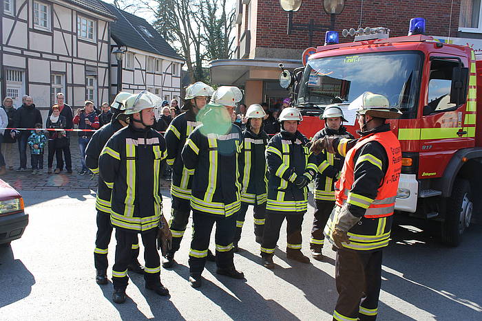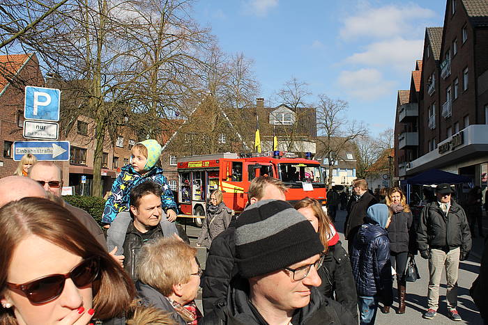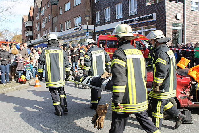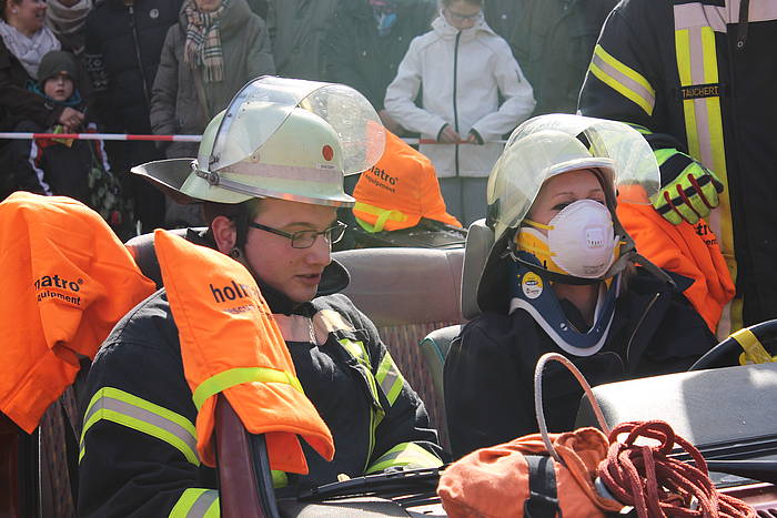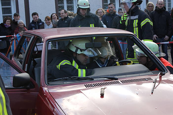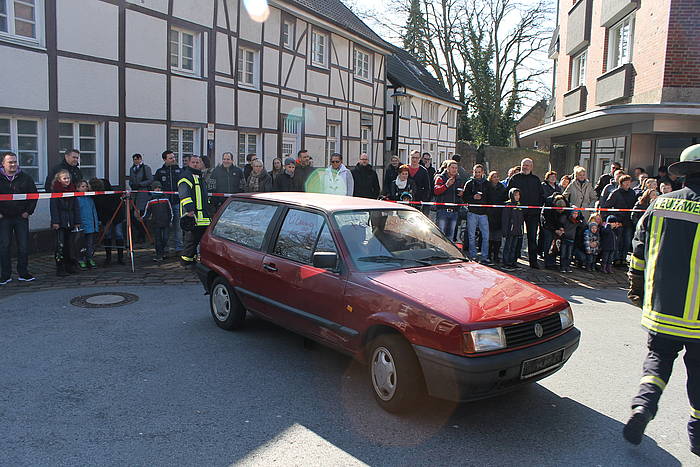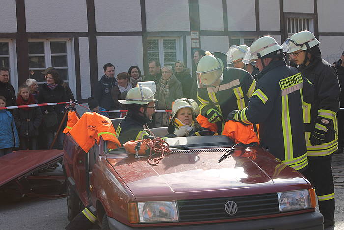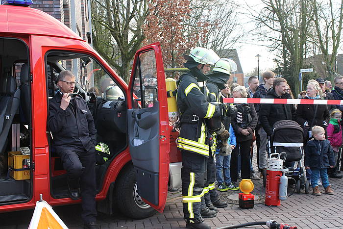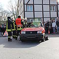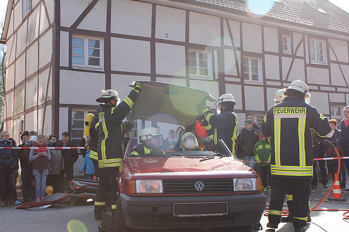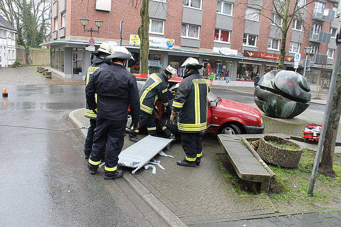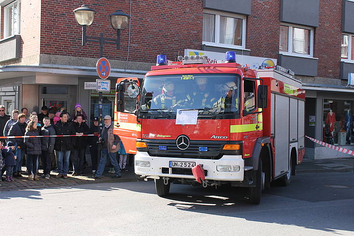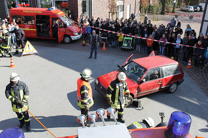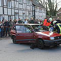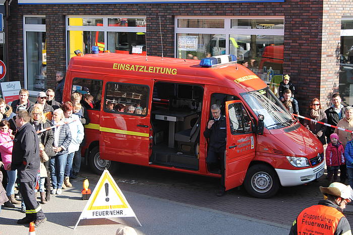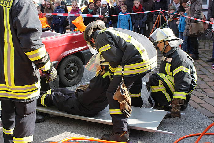 Der Sonntag präsentierte sich aber vollständig anders. Zwar war es immer noch kalt, aber strahlende Sonne und Trockenheit lockten die Gäste wohl aus dem gesamten Umland zu einem Bummel durch die verkaufsoffenen Werner Läden. Auch bei der Feuerwehr war nun einiges los. Um 15:00 Uhr präsentierte man daher eine fachgerechte und nach Feuerwehr-Dienstvorschrift durchgeführte technische Hilfeleistung mit Menschenrettung aus einem verunglückten Fahrzeug. Die Übung wurde über die Lautsprecheranlage des ELW derart kommentiert, dass die Zuschauer jeden der notwendigen Schritte verstehen konnte. Ohne Hektik wurden die Arbeitsschritte durchgeführt und für jeden verständlich erläutert. Diese Übung schaute sich eine durchaus beachtliche Zuschauerzahl an.