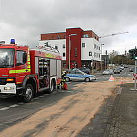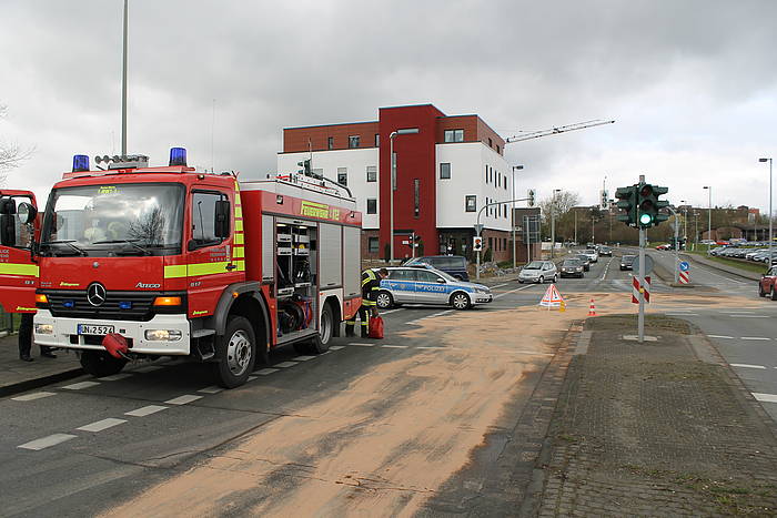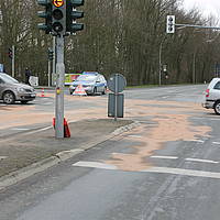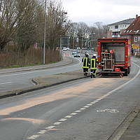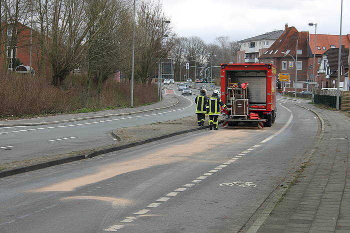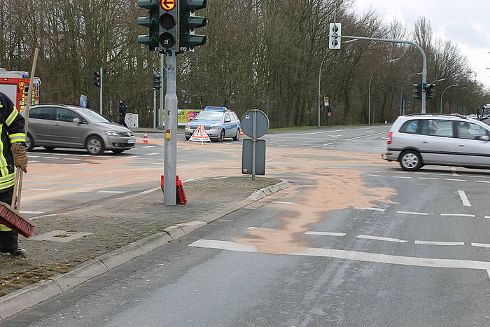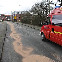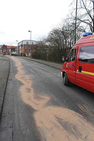 Erneut zog sich eine lange Ölspur durch Werne. Über 5,5 km - von der Nordlippestraße bis zum Gewerbegebiet Brede – musste die Straße durch die Feuerwehr und ein Spezialunternehmen gereinigt werden. Polizei und Feuerwehr waren mehr als vier Stunden im Einsatz.