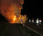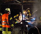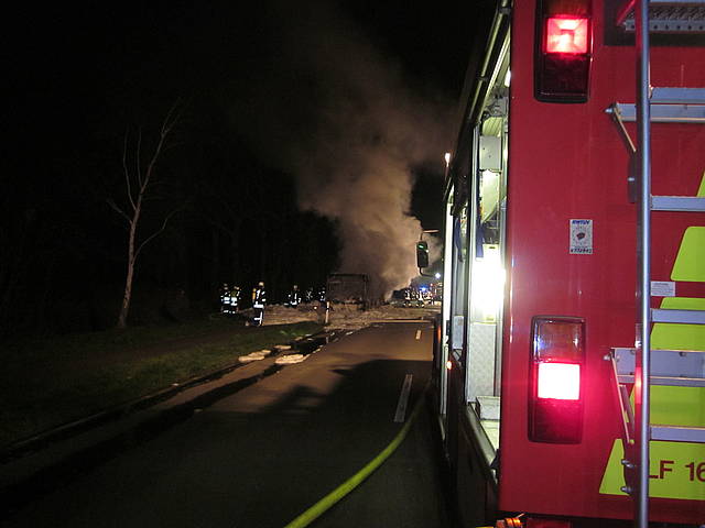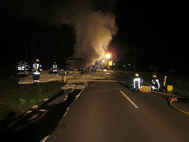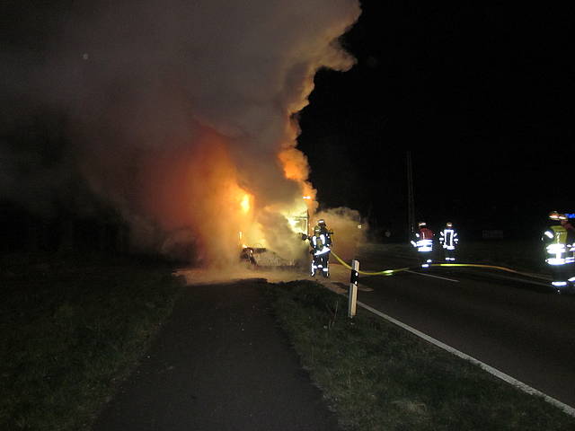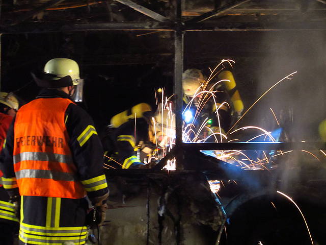 Trotz eines massiven Löschangriffs mit zunächst zwei C-Rohren und nachfolgend einem Mittelschaum-Rohr war das Fahrzeug nicht mehr zu retten. Insgesamt zogen sich die Löscharbeiten bis gegen Mitternacht hin, wobei das Fahrzeug systematisch mit der Wärmebildkamera untersucht wurde, um alle Glutnester zu löschen. Insbesondere im Bereich der Hinterachse hielt sich die Hitze, so dass der Fahrzeugboden mit einem Winkelschleifer geöffnet werden musste, um Reifen und Metallteile zu löschen resp. zu kühlen. Insgesamt wurden sechs Trupps unter Atemschutz eingesetzt, die ca. 200 Liter Schaummittel und mehrere 1000 Liter Löschwasser verbrauchten. Zur Löschwasserversorgung wurde ein Pendelverkehr mit einem Löschfahrzeug genutzt sowie eine ca. 500 m lange Schlauchleitung von der Butenlandwehr aufgebaut.