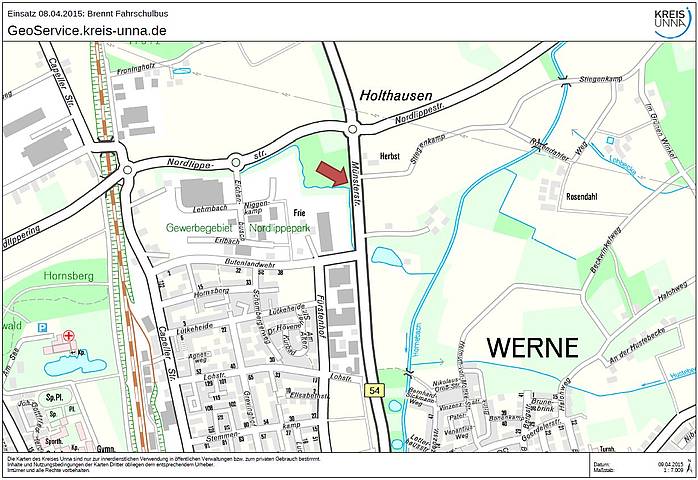 Im Einsatz waren ca. 30 Feuerwehrleute mit sieben Fahrzeugen, mehrere Streifenwagen der Polizei, die Untere Wasserbehörde sowie der Rettungsdienst Werne. Gegen 1:00 Uhr am Freitag (09.04.2015) konnte die Einsatzstelle an die Polizei übergeben werden. Während der Löscharbeiten und der Bergung des ausgebrannten Wracks war die B54 zwischen Butenlandwehr und dem Kreisverkehr Nordlippestraße in beiden Richtungen gesperrt.