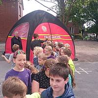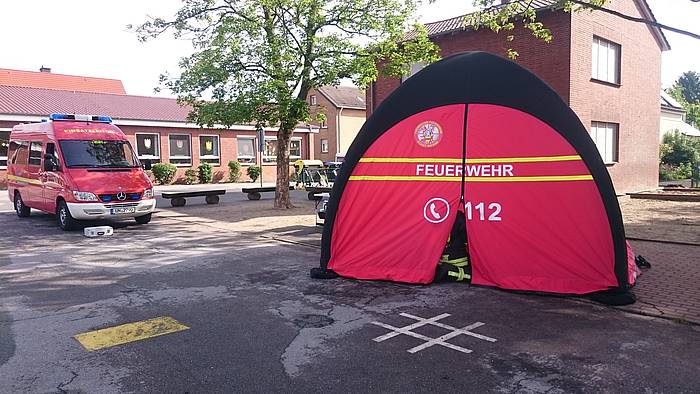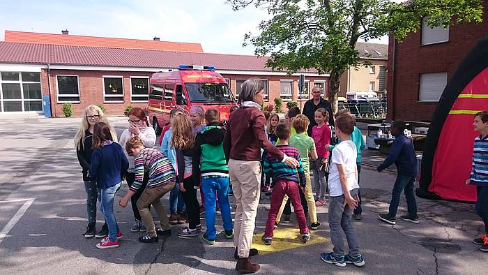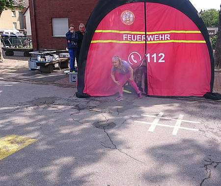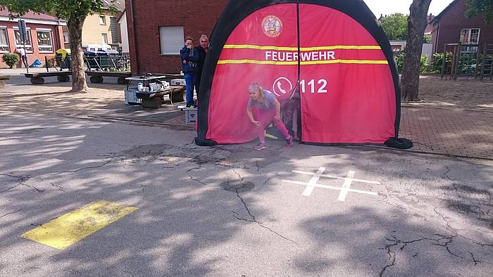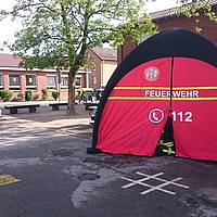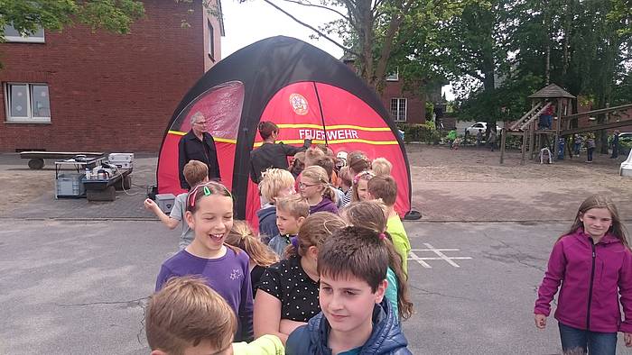 Auf dem Schulhof ging es dann in die Praxis. Per simulierter Rettungsleitstelle konnten die Kinder anhand von fiktiven Szenarien einen Notruf absetzen und sprachen dabei mit einem "realen" Disponenten am anderen Ende der Leitung. Das klappte auch sehr gut, weshalb die letzte Übung - das Rauchzelt - anstand.
