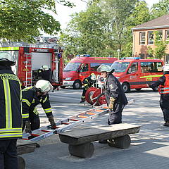 In erster Priorität wurden mittels der Steckleiter vier Personen, in diesem Fall Mitglieder der Jugendfeuerwehr, aus dem ersten Stockwerk, eine per Drehleiter über das Dach gerettet.