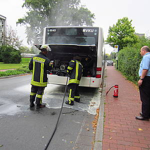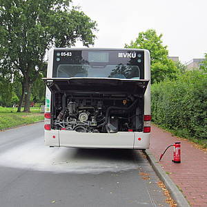 Gegen 10:15 Uhr wurde der Löschzug 1 der Freiwilligen Feuerwehr Werne zu einem Schwelbrand in einem Bus der Verkehrsgesellschaft im Kreis Unna (VKU) alarmiert. Im Holtkamp bemerkte der Fahrer des Gelenkbusses bei einem Wendemanöver die Rauchentwicklung hinter dem Fahrzeug und alarmierte gleich die Feuerwehr. Bei der Kontrolle stellte der Fahrer fest, dass die Lichtmaschine beschädigt war und Feuer gefangen hatte. Geistesgegenwärtig setzte er den im Fahrzeug verfügbaren Feuerlöscher ein, um den Entstehungsbrand zu löschen. So konnte größerer Schaden verhindert werden.