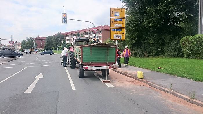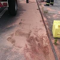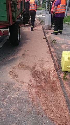 Das bei der Feuerwehr verfügbare Bindemittel ist nicht für die umfassende Straßenreinigung nach Hydrauliköl-Unfällen geeignet, sondern kann Motoröl oder Kraftstoffe aufnehmen. Daher wurde gemeinsam mit der Polizei entschieden, ein Spezialunternehmen für Umwelt-Technik mit der Straßenreinigung zu beauftragen.