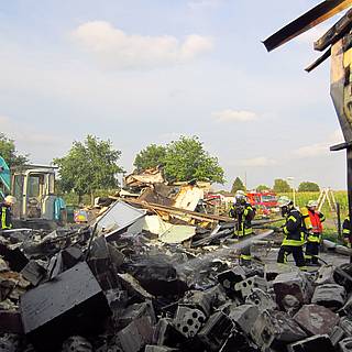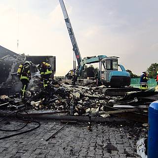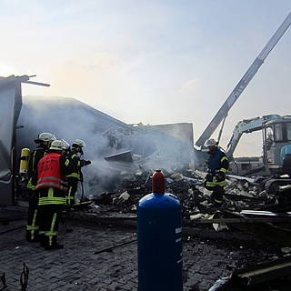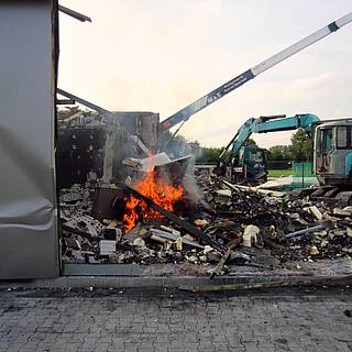 Die Feuerwehr verschaffte sich Zugang zum Gelände und löschte den Brand, der bereits nach ca. 10 Minuten unter Kontrolle war. Obwohl die Kontrolle mit Hilfe der Wärmebildkamera positiv verlief, sollte aus Sicherheitsgründen der Schutthaufen durch den an der Baustelle verfügbaren Bagger auseinander gezogen werden, wozu der Abrissunternehmer benachrichtigt wurde. Bei dessen Eintreffen wurde festgestellt, dass aus dem Bagger offensichtlich Diesel entwendet wurde. Der Bagger sprang nicht an, konnte aber zumindest über den Anlasser aus dem Gefahrenbereich entfernt werden. Der Schutthaufen wurde daher mit einem Schaumteppich abgedeckt, um ein Rückzünden etwaiger Glutnester zu verhindern.