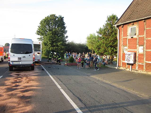 Um 7:35 Uhr wurde die Löschgruppe Holthausen und der Löschzug 1 der Freiwilligen Feuerwehr Werne zu einem Verkehrsunfall auf der Münsterstraße in Höhe des Wehrenboldweg gerufen. Rund 40 Schulkinder hatten Glück im Unglück, denn ein Mercedes-Sprinter fuhr aus ungeklärter Ursache nahezu ungebremst auf einen Gelenkbus auf, der als Schulbus eingesetzt war. Fahrer und Beifahrer des Sprinters wurden dabei teils schwer verletzt und vom Rettungsdienst Werne in ein Krankenhaus gebracht. Alle Kinder und der Busfahrer blieben unverletzt!