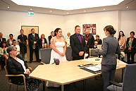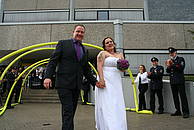Tradiononell schreitet das frischgebackene Hochzeitspaar durch die gelben Schlauchbögen , welche während der Trauung von den Kameradinnen und Kameraden vor dem Stadthaus aufgebaut wurden.