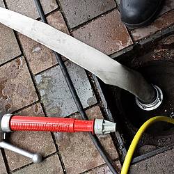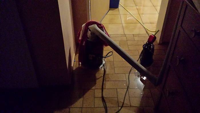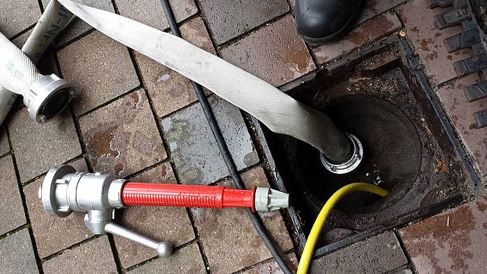 Aus Sicherheitsgründen wurde der Strom abgestellt und eine Tauchpumpe zum Entfernen des Wassers aus dem Keller vorgenommen. Technisch bedingt können diese Tauchpumpen ab ca. 5 cm Wasserhöhe eingesetzt werden.