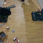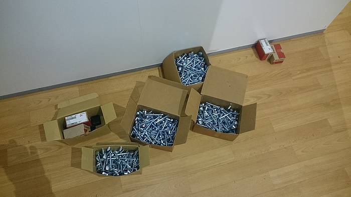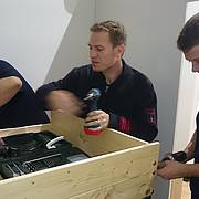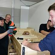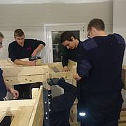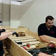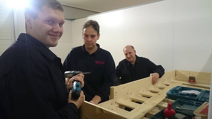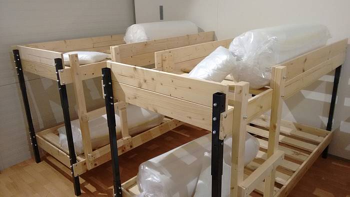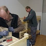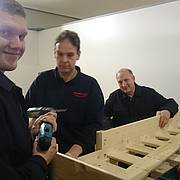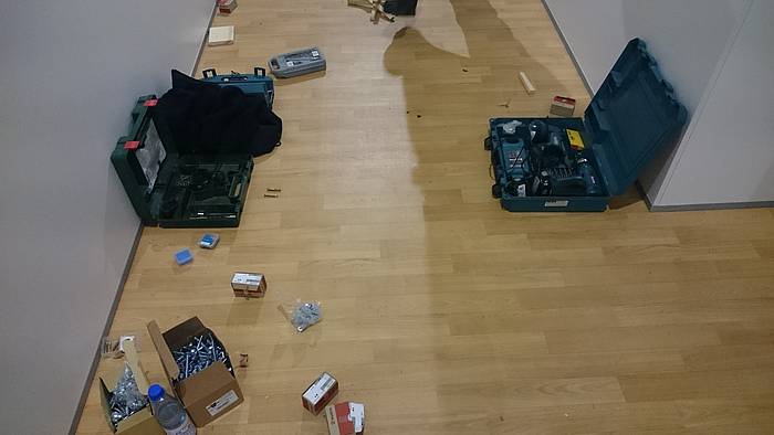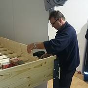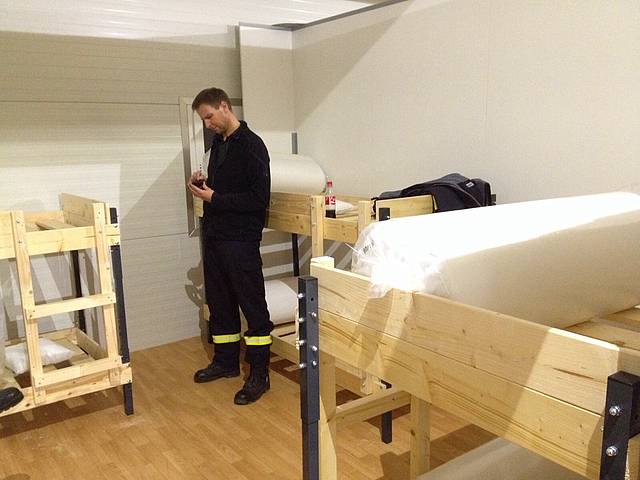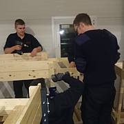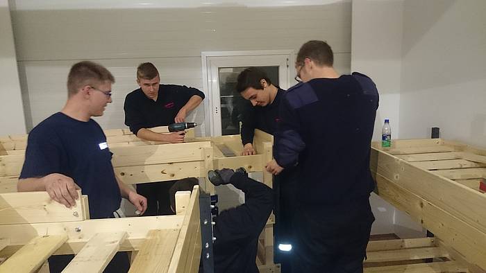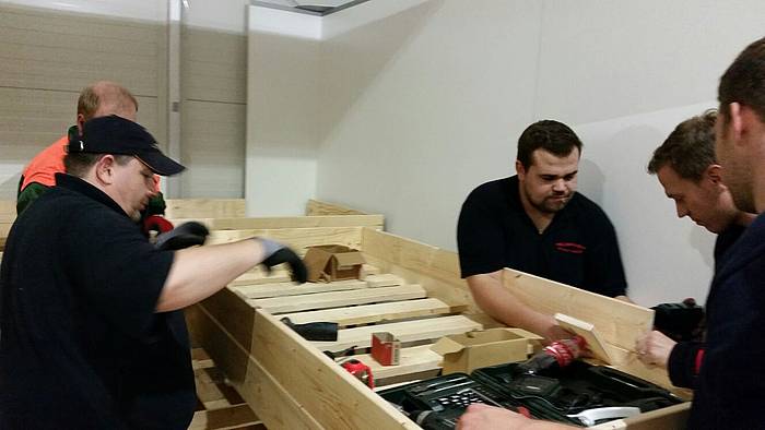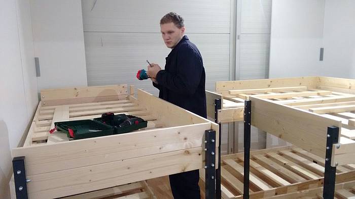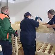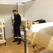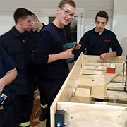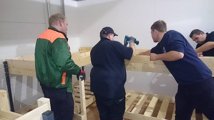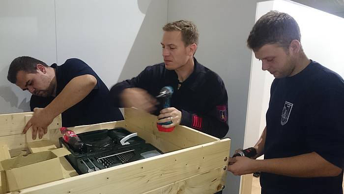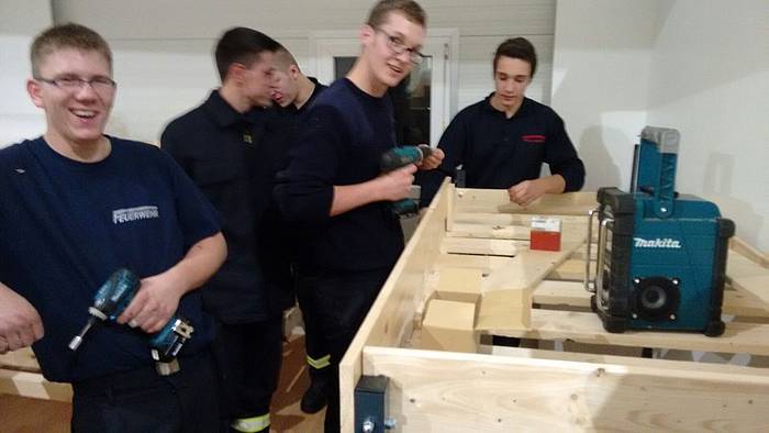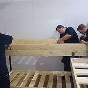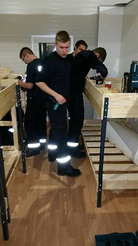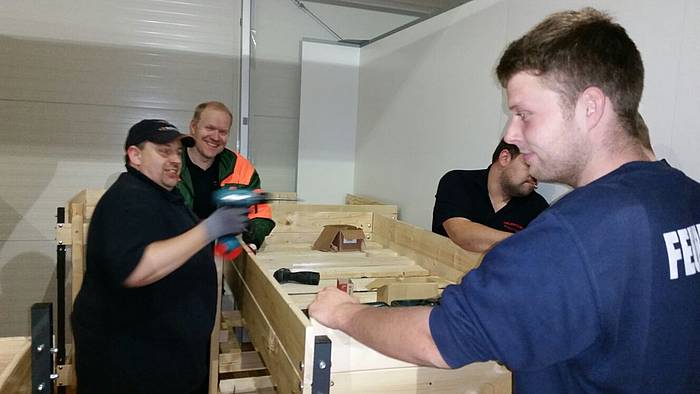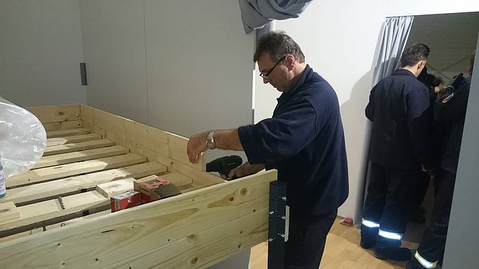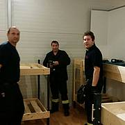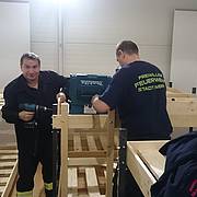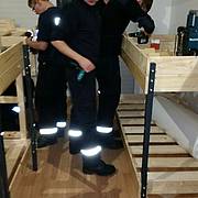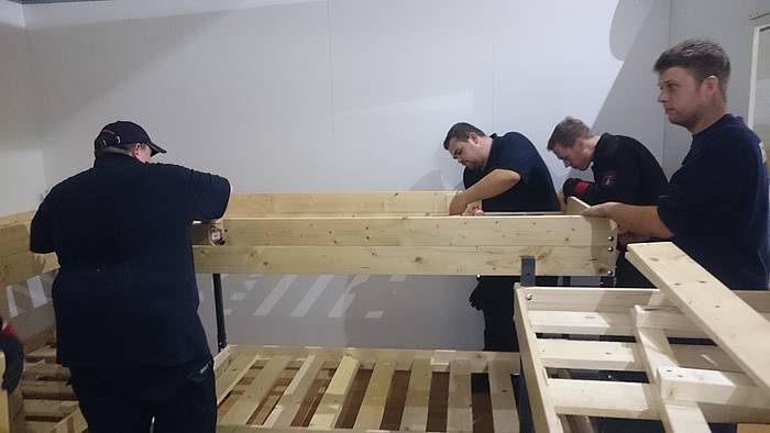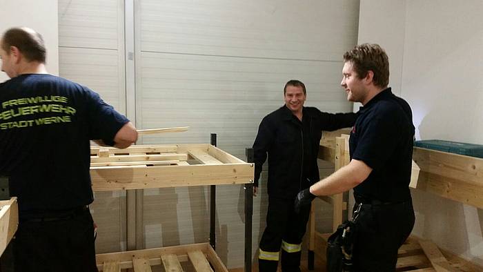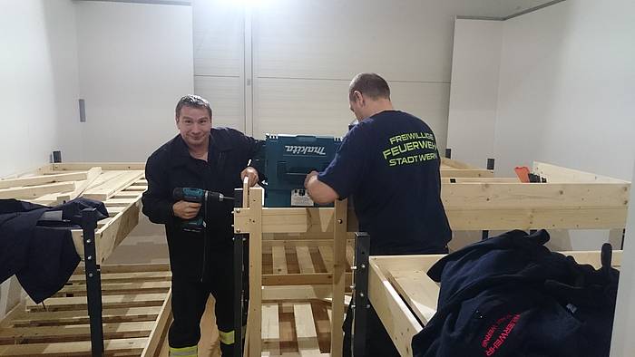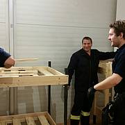 Etliche Feuerwehrleute hatten ihr privates Werkzeug mitgebracht, so dass einige Kameradinnen und Kameraden den Transport der Betten in die Schlafkammern übernahmen, diese dort vormontierten und die "Werkzeug-Besitzer" diese Betten fertig stellen konnten. Neben dem Verschrauben der Gestelle, war an den Stockbetten insbesondere die Holzleitern sowie der Fallschutz aus Holz zu montieren.